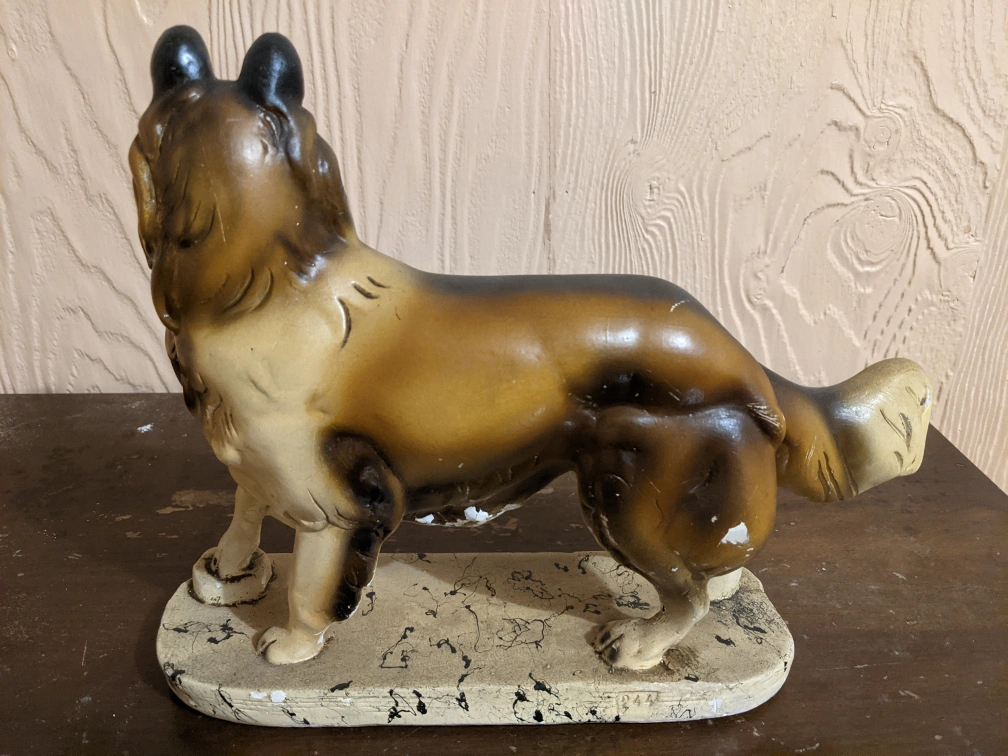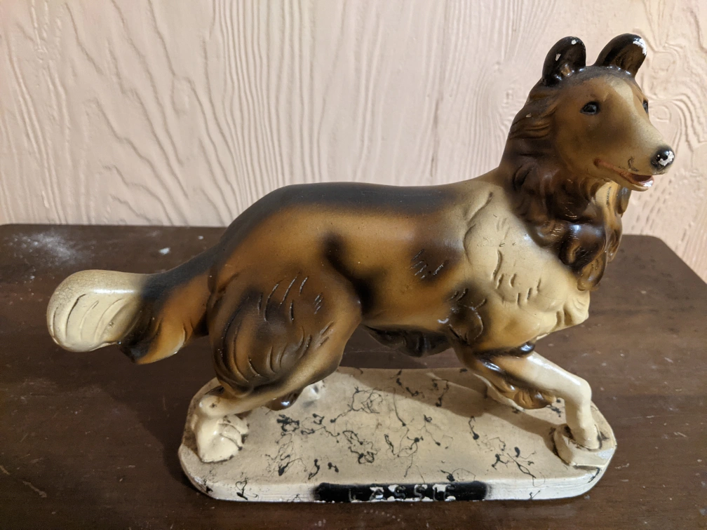 For a dog lover who loves Lassie. Slightly chipped, needs some cleaning and love