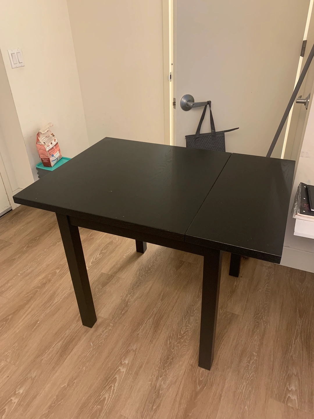 Black wooden dining room table, small and adjustable so easy to fit in a small area. Used but not often.