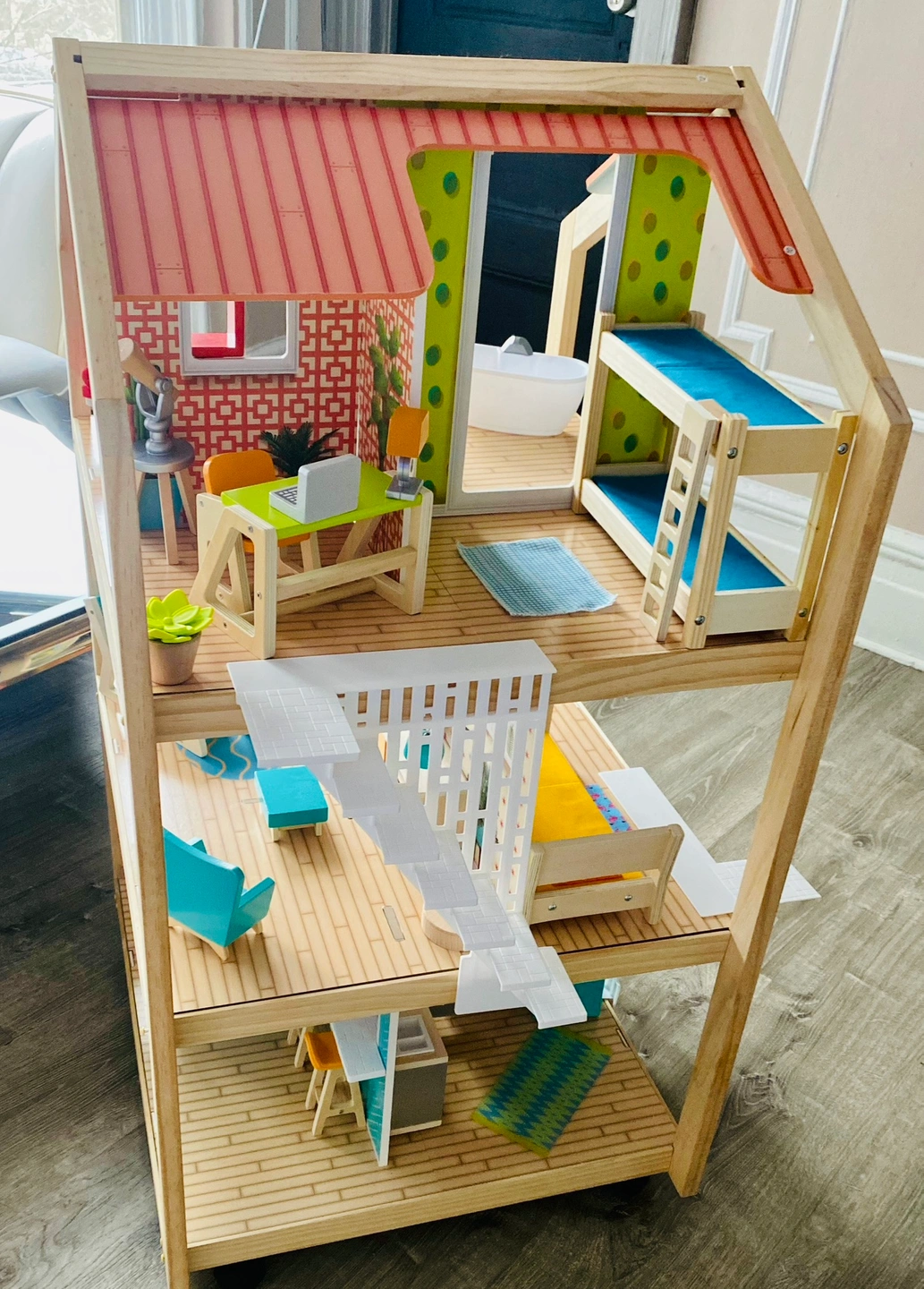 MADE OF WOOD: Durable wooden construction to last through years of imaginative play. Helps you pass dollhouse down from kid to kid. NO WALLS: Open concept design all the way around so kids can share the play without getting in each other's way. ON WHEELS: Move wooden dollhouse from room to room so play can go wherever you are. Easy for kids to push and spin around on their own. FULLY FURNISHED: With 42 furniture pieces and accessories, this dollhouse is move-in ready for play to start right out of the box. MID-CENTURY DESIGN: Full of bright bold colors and trendy patterns, this dollhouse has a mod style that really stands out. Product Dimensions ‎26.8 x 23.25 x 43.3 inches Item Weight ‎48.5 pounds lo ok lo is