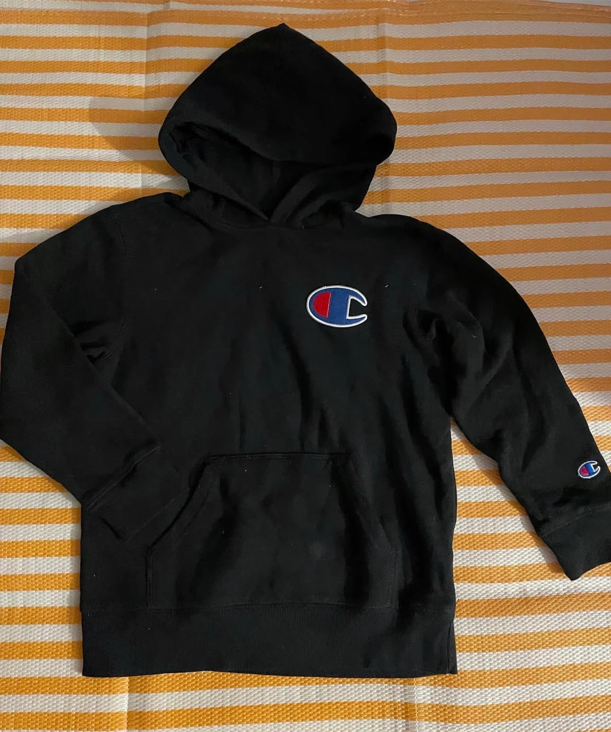 This is a black Champion hoodie with the classic C logo on the chest and sleeve. It features a front pocket and a hood. Cotton blend material.
