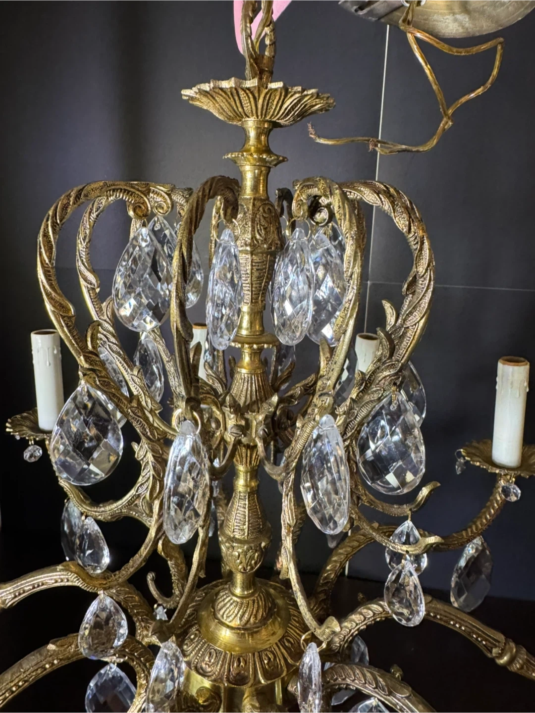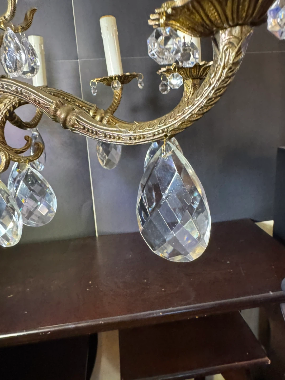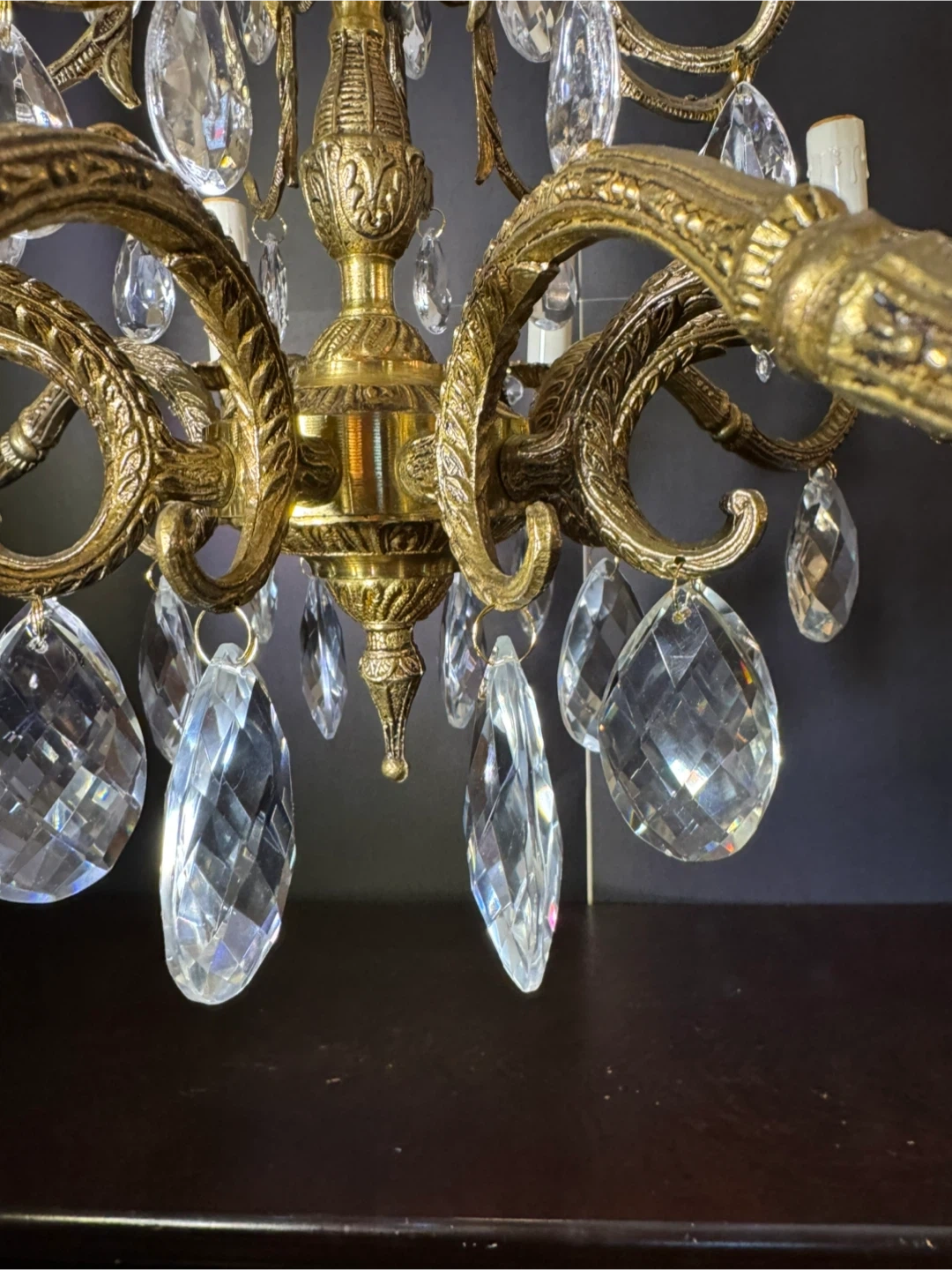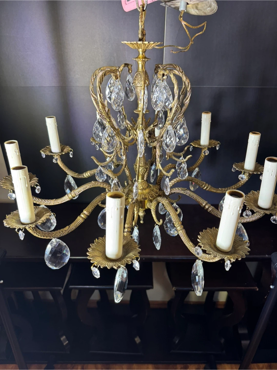 Beautiful ornate brass chandelier with crystal teardrop and faceted embellishments. It's designed with 10 arms, each holding a candle-style light socket. This piece would add elegance to any room. High 30 inches, diameter 23 inches