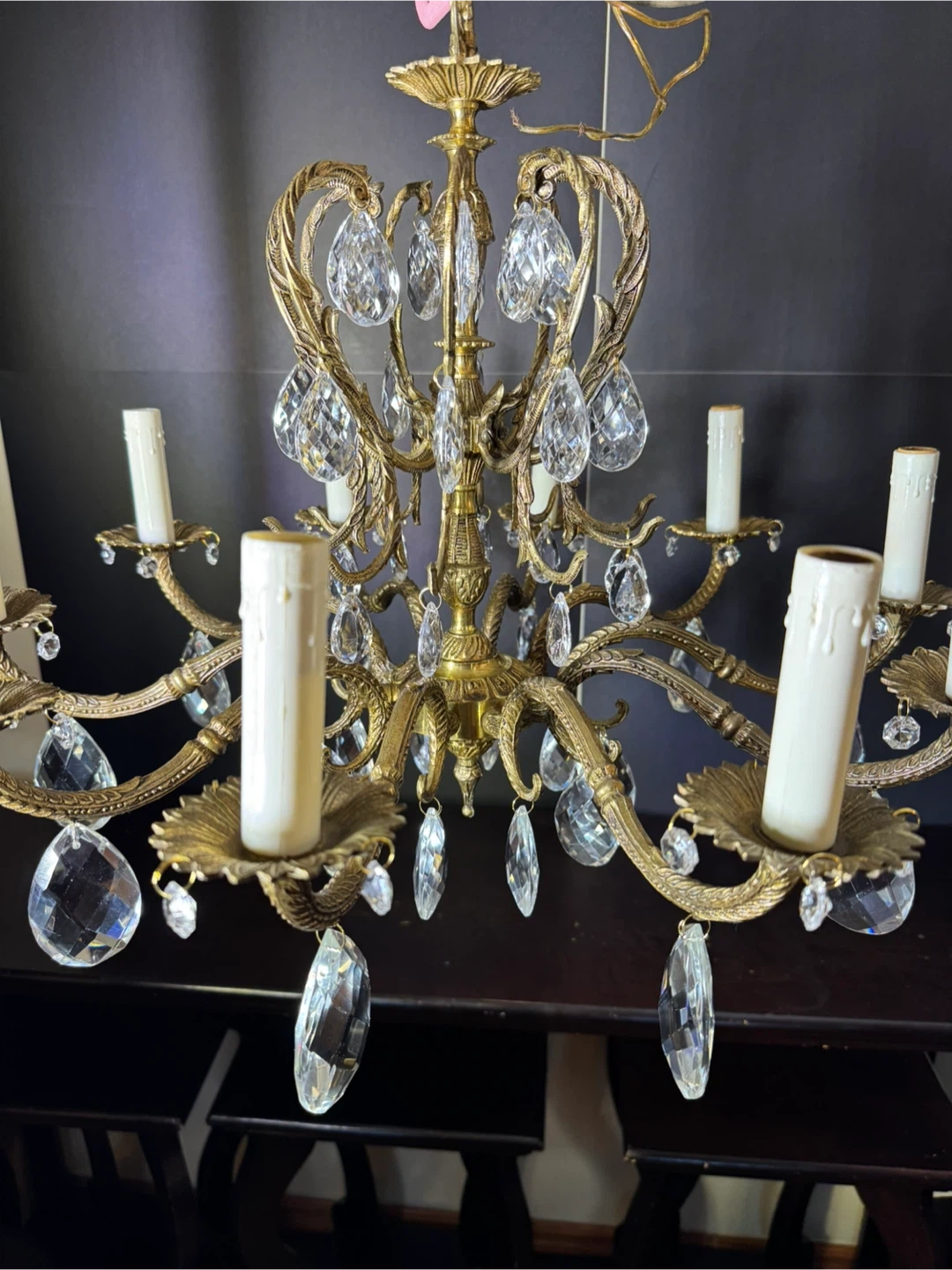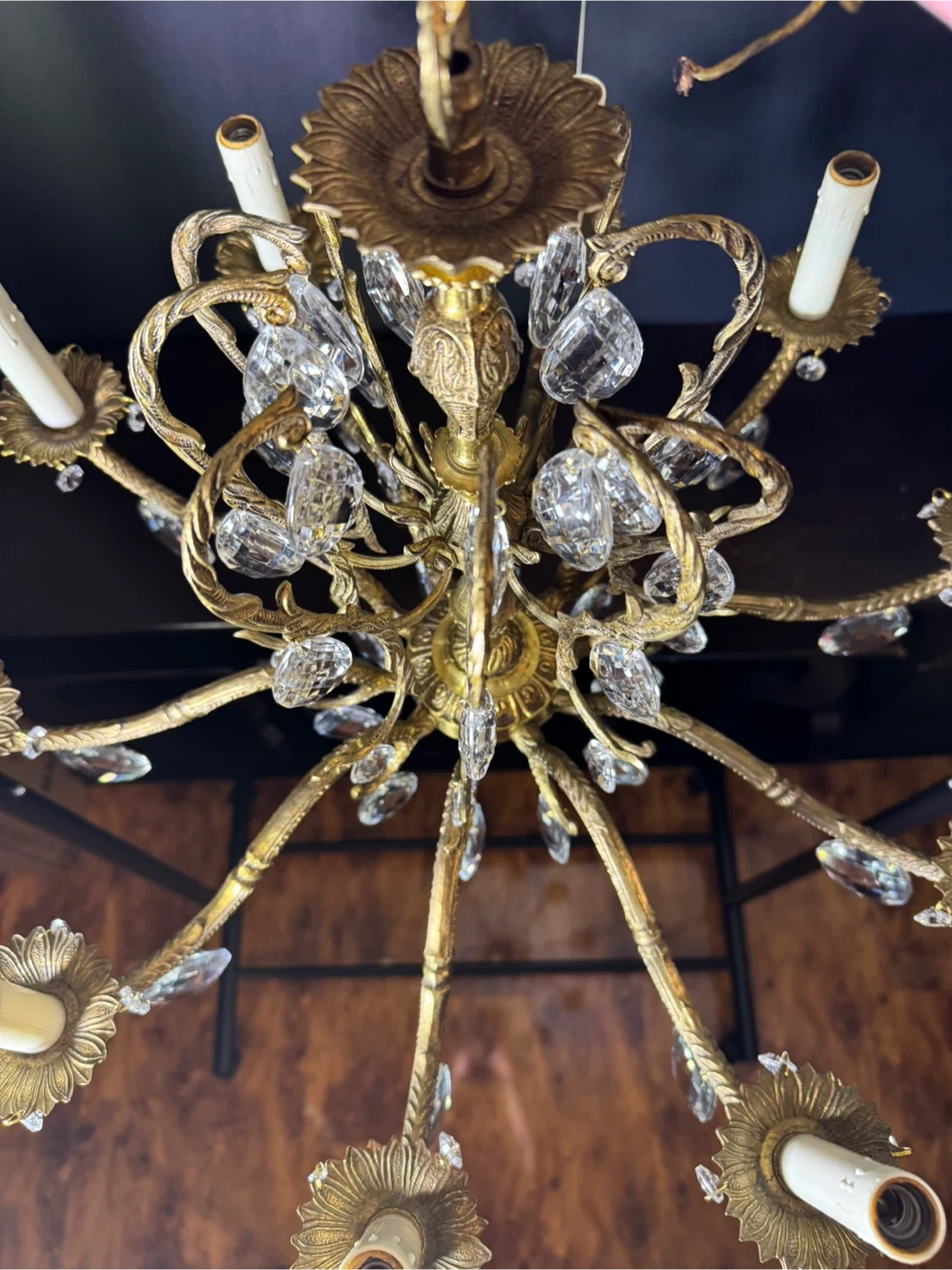 Beautiful ornate brass chandelier with crystal teardrop and faceted embellishments. It's designed with 10 arms, each holding a candle-style light socket. This piece would add elegance to any room. High 30 inches, diameter 23 inches