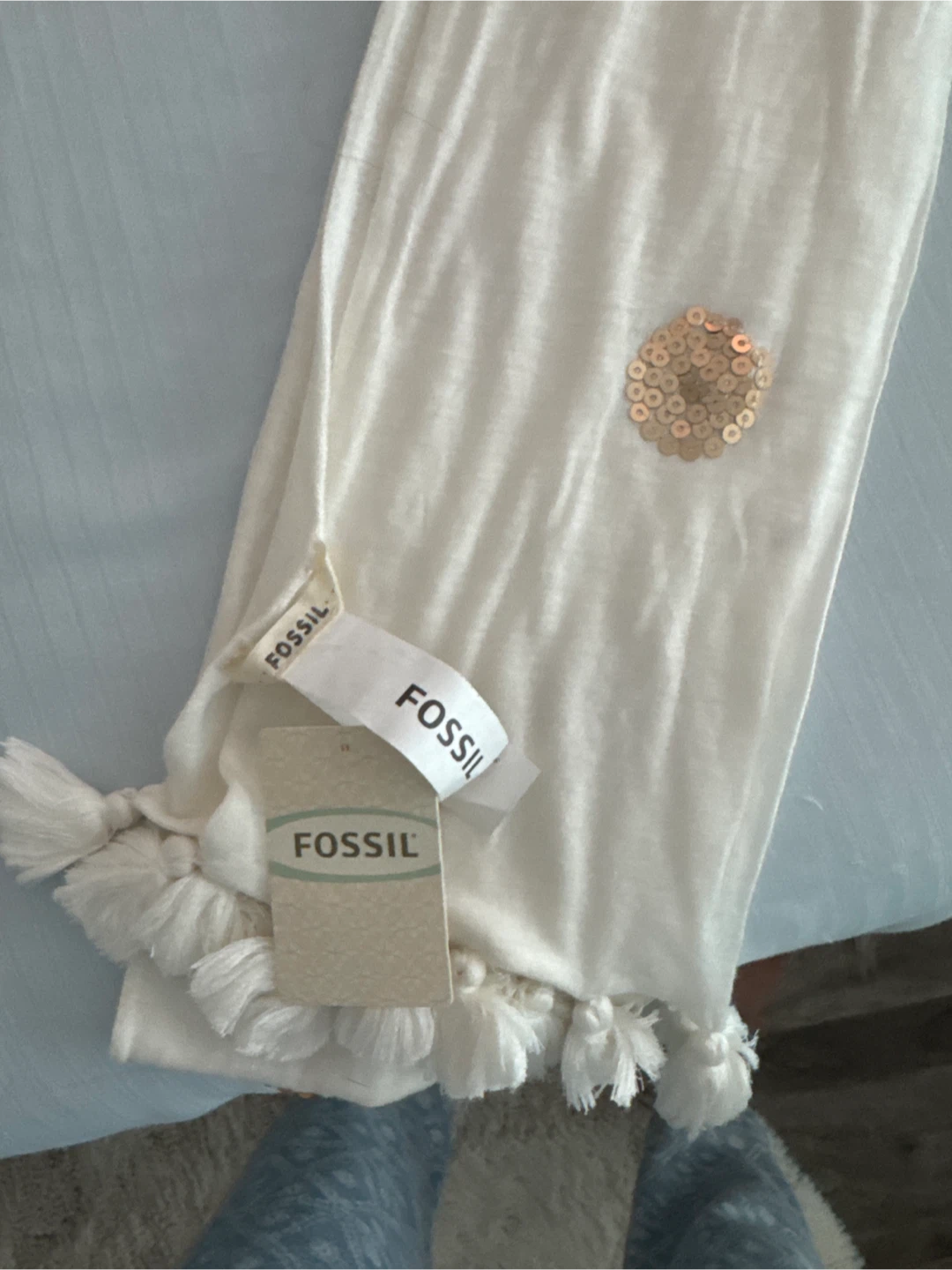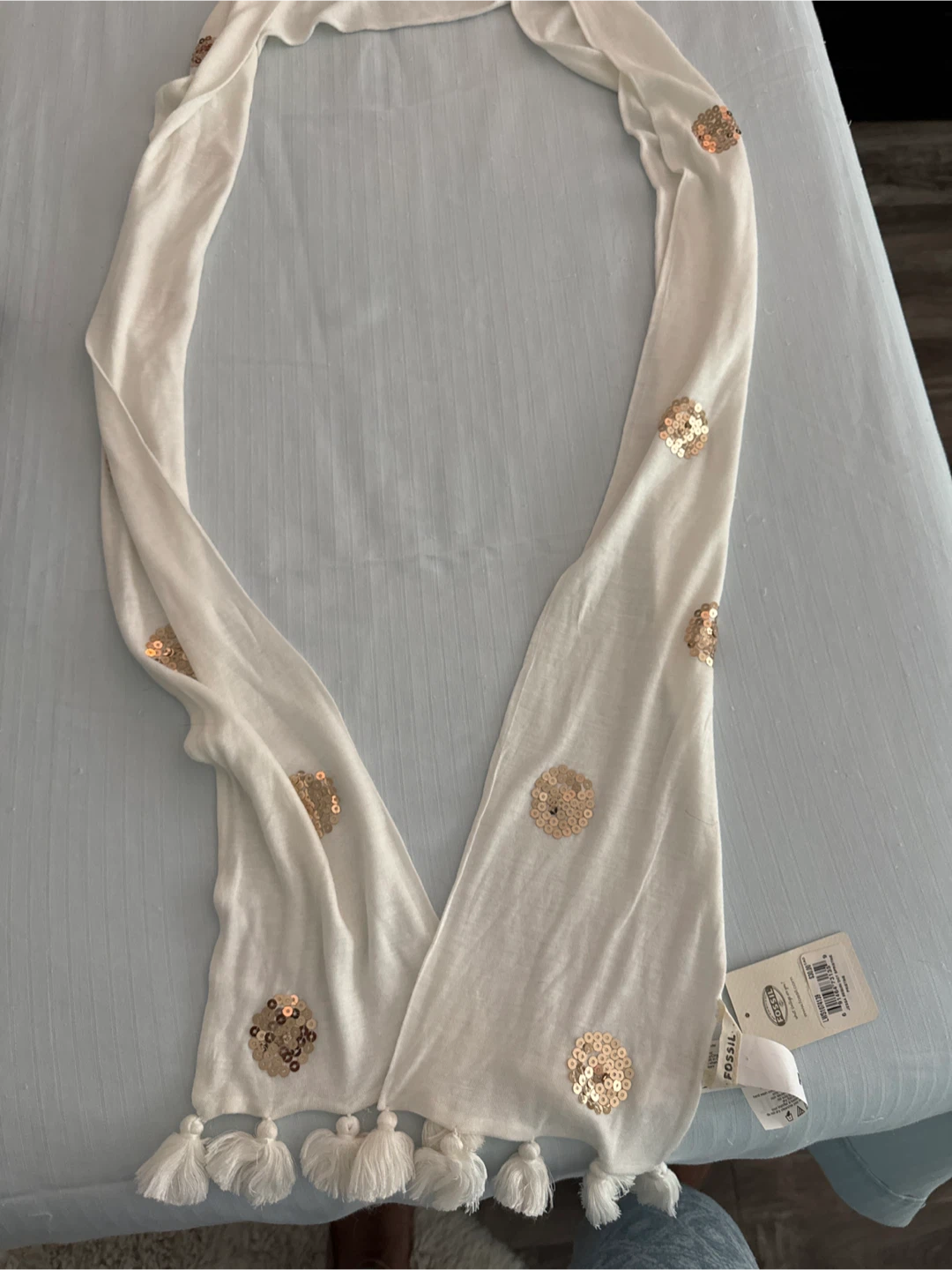 Here's a lovely Fossil scarf in new condition, complete with tags! It's a beautiful off-white colour and features cute sequin flower accents and tassel details -great for the holiday sparkle