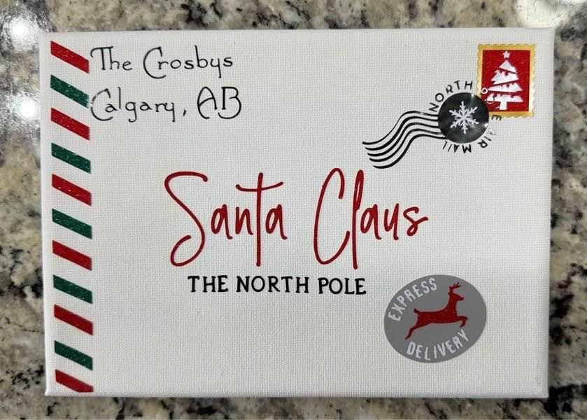 Letter to Santa, 5 x 7“ canvas. Available as is (1st picture), or with addition of name, city province, and air mail letters (2nd picture) for an additional $5. Pick up in Northwest Calgary.
