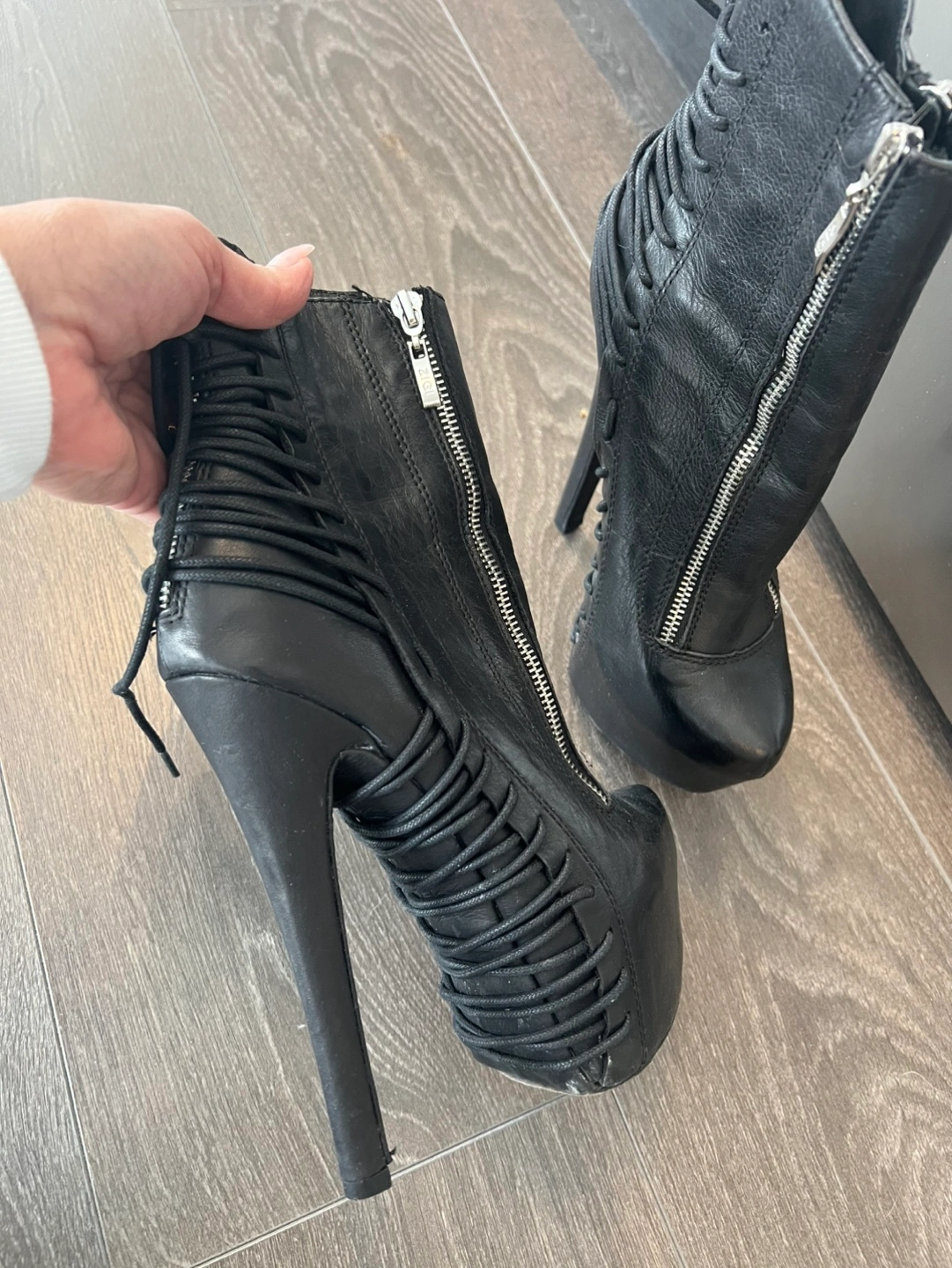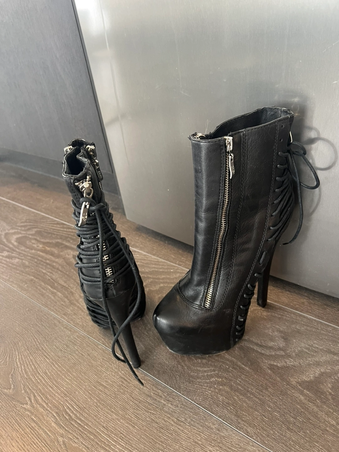 Black leather ankle boots. Features lace-up detailing and a side zipper. High stiletto heel and platform sole. Size 7.5. Original price $330