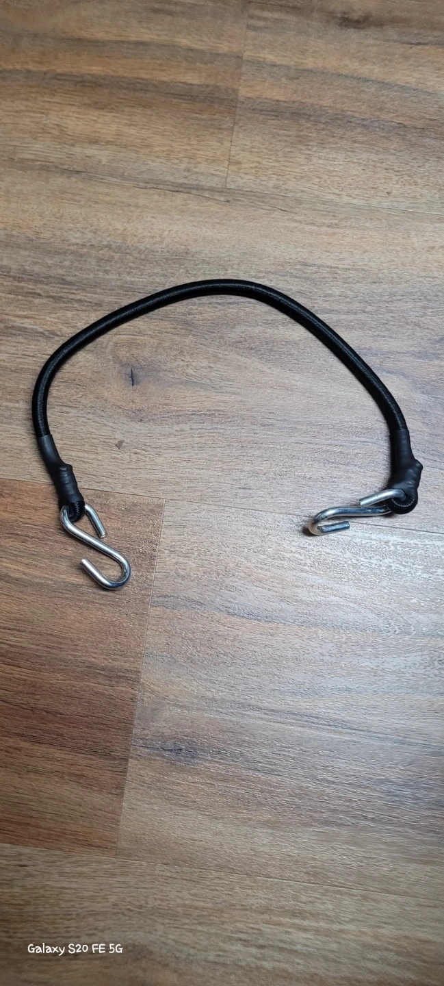 A black bungee cord with S-hooks on both ends. It's made of elastic material and features metal hooks for secure attachment. This cord is useful for securing items to vehicles or storage spaces.