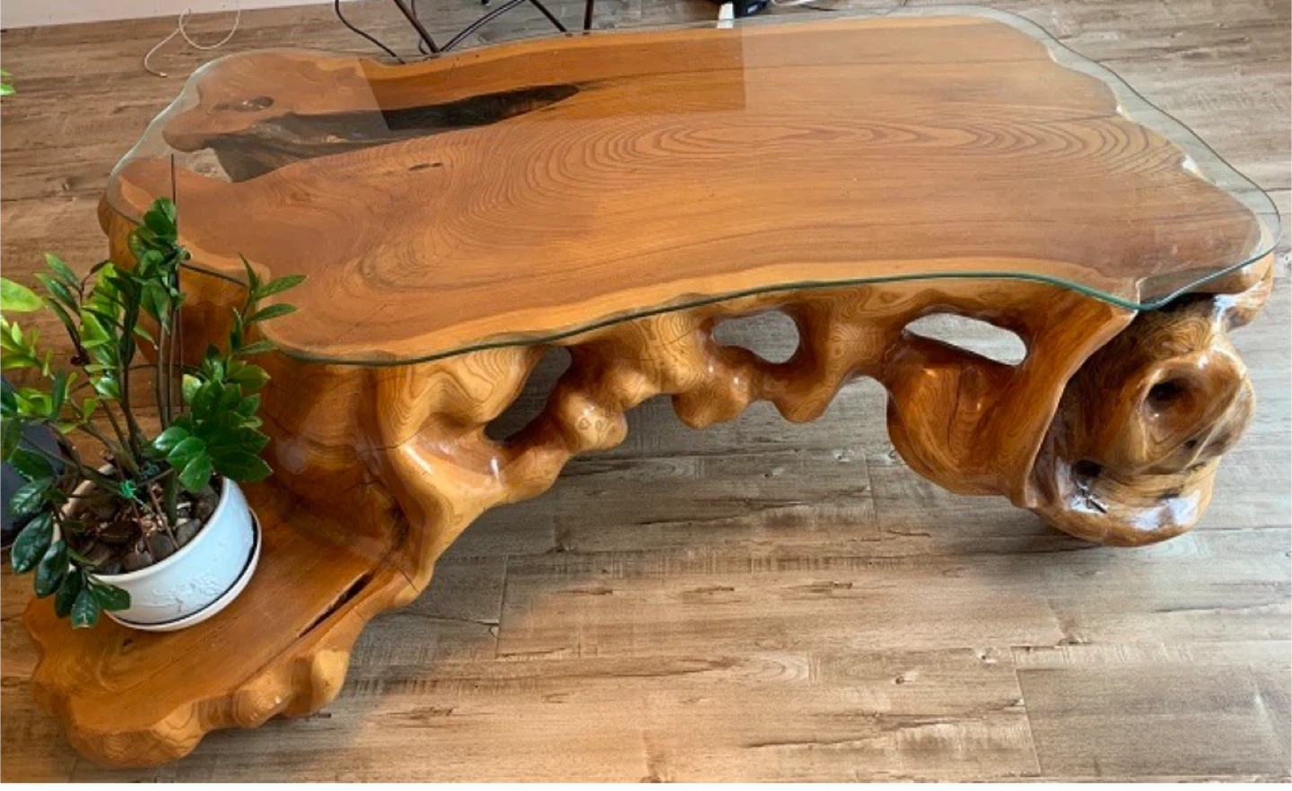 Check out this unique coffee table! It features a beautiful wood base with a glass top. The wood has a really interesting, natural shape that's sure to be a conversation starter. It's in great condition and ready to add some character to your living room