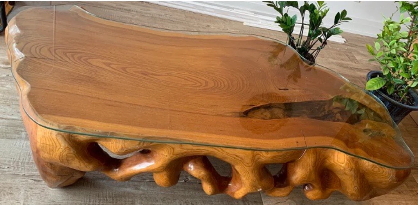 Check out this unique coffee table! It features a beautiful wood base with a glass top. The wood has a really interesting, natural shape that's sure to be a conversation starter. It's in great condition and ready to add some character to your living room