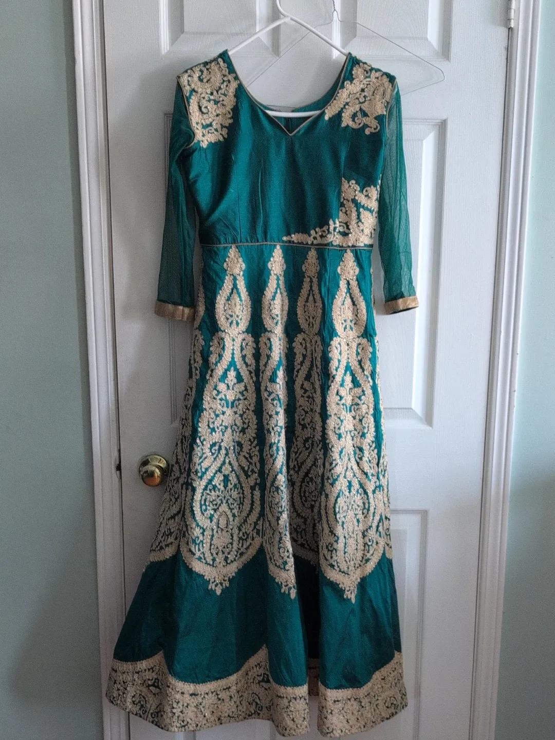 Beautiful teal long dress with intricate gold embroidery. Sheer sleeves and gold trim accents. This dress is perfect for special occasions.