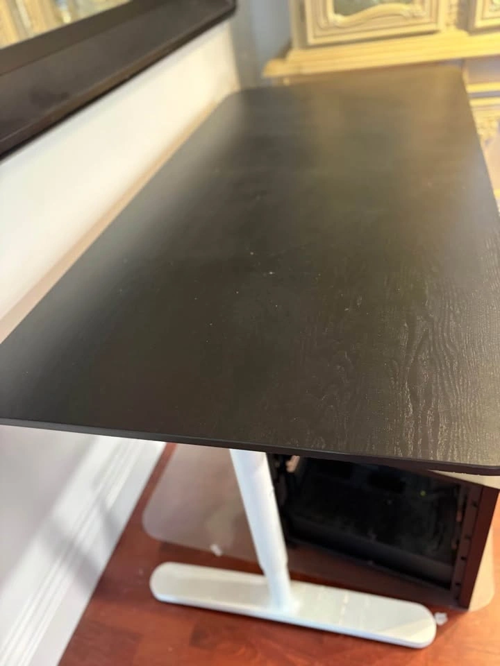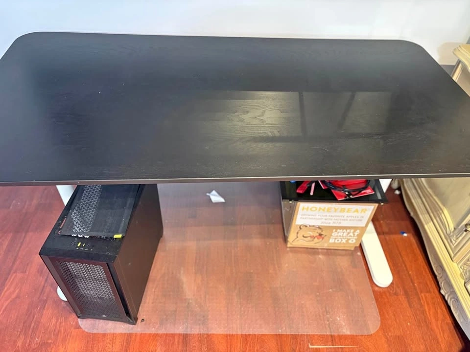 Large modern wooden desk. Size: 63 inches. Material: thick engineered wood + metal frame. Rating: about 4.4⭐. Good for 2–3 monitors, Gaming PC + keyboard + mouse, and a large workspace. Very strong and stable with a modern wood design.