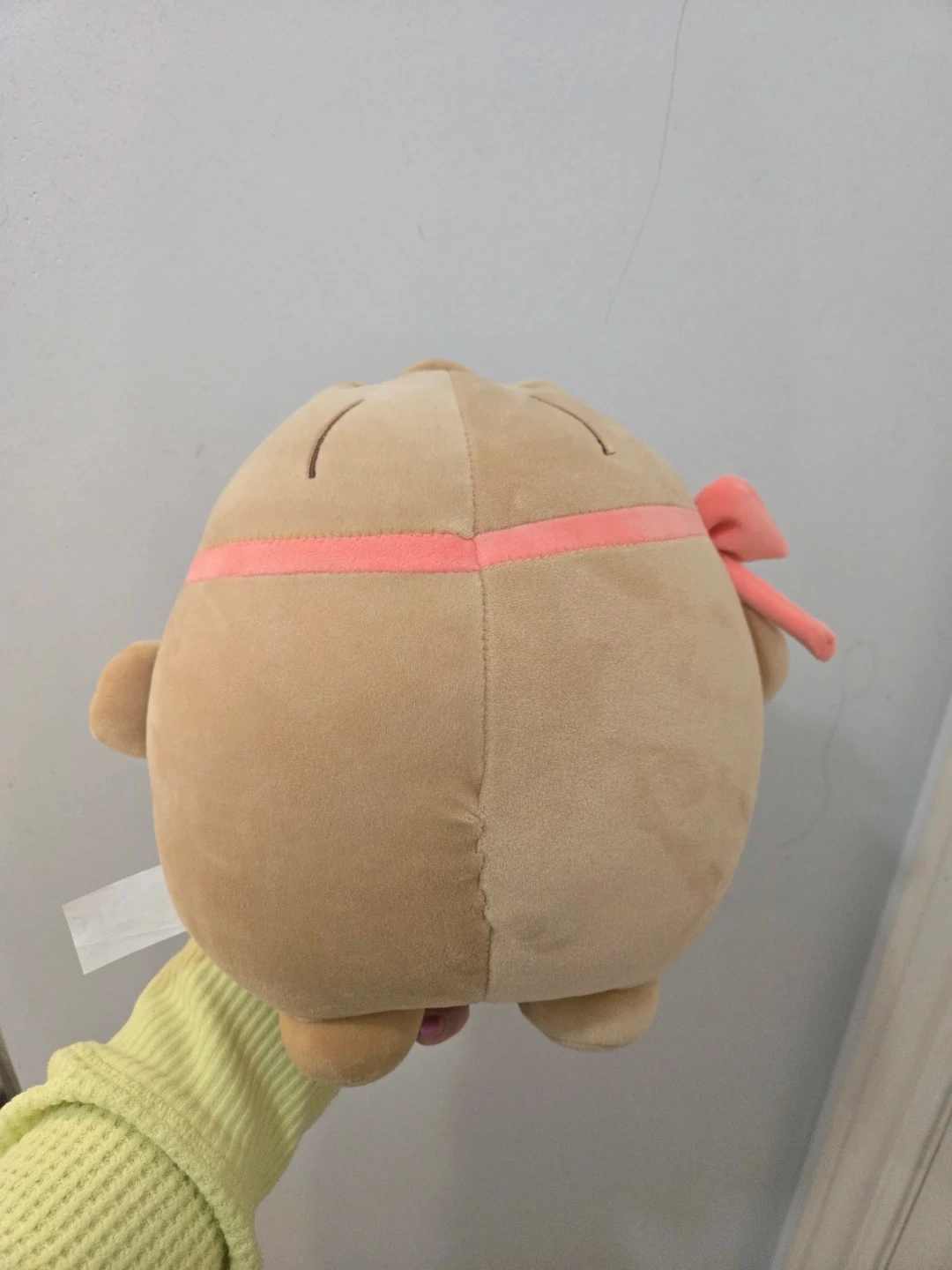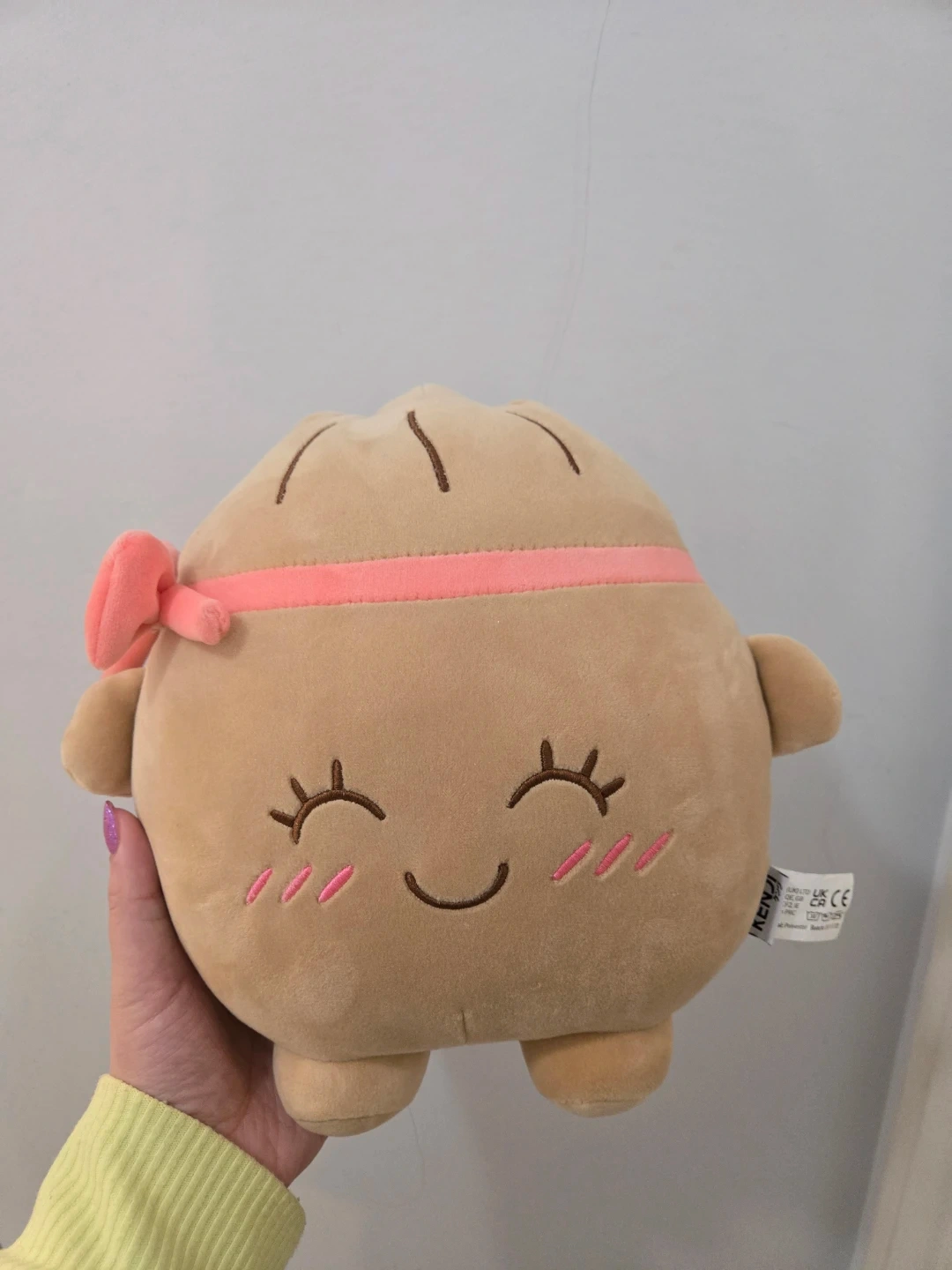 This is a super soft and cuddly plush toy shaped like a cute dumpling. It's wearing a pink headband and bow, with adorable embroidered facial features. It's made from a fuzzy material and feels great to hug! I got it from sunrise records so it is new.