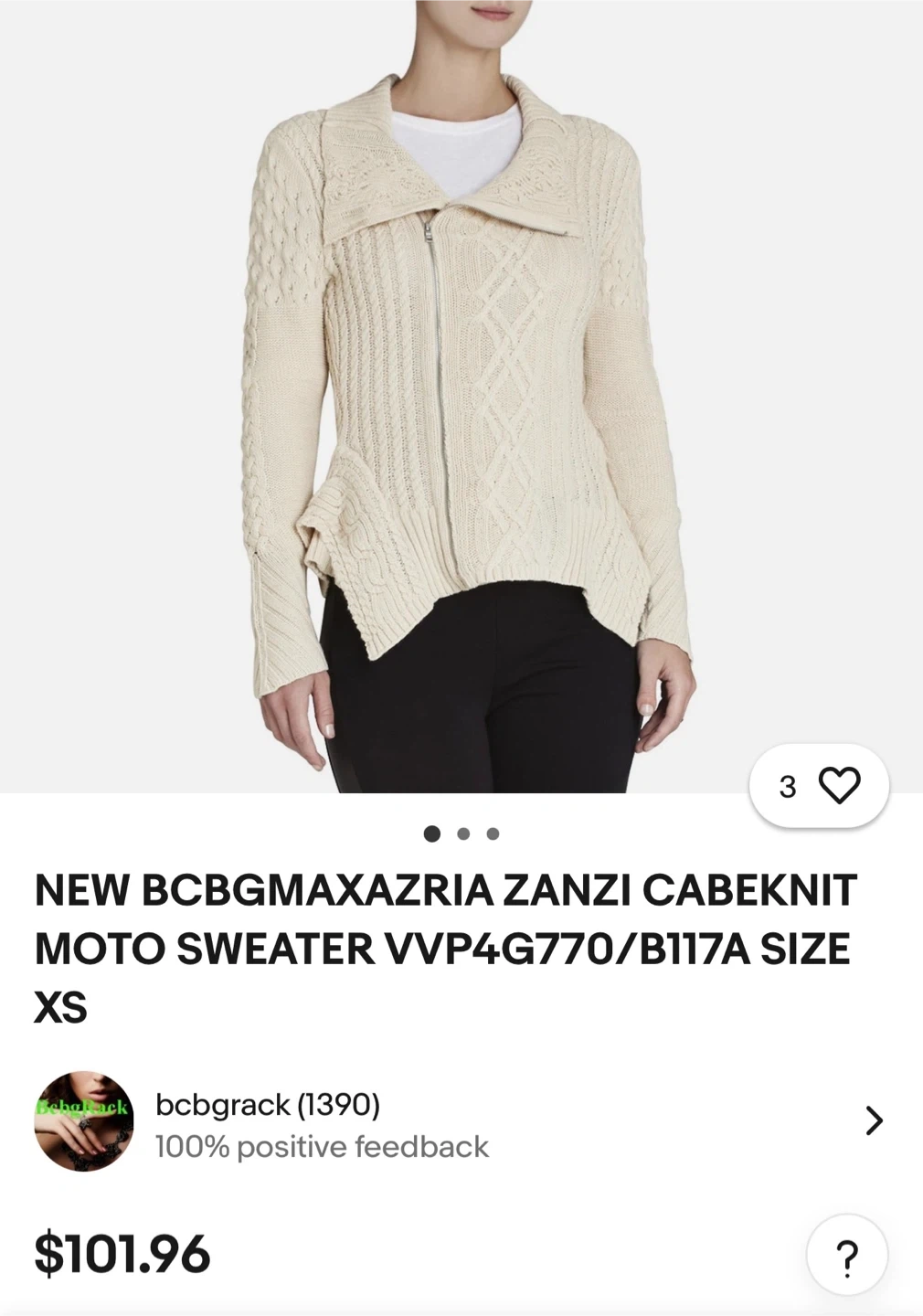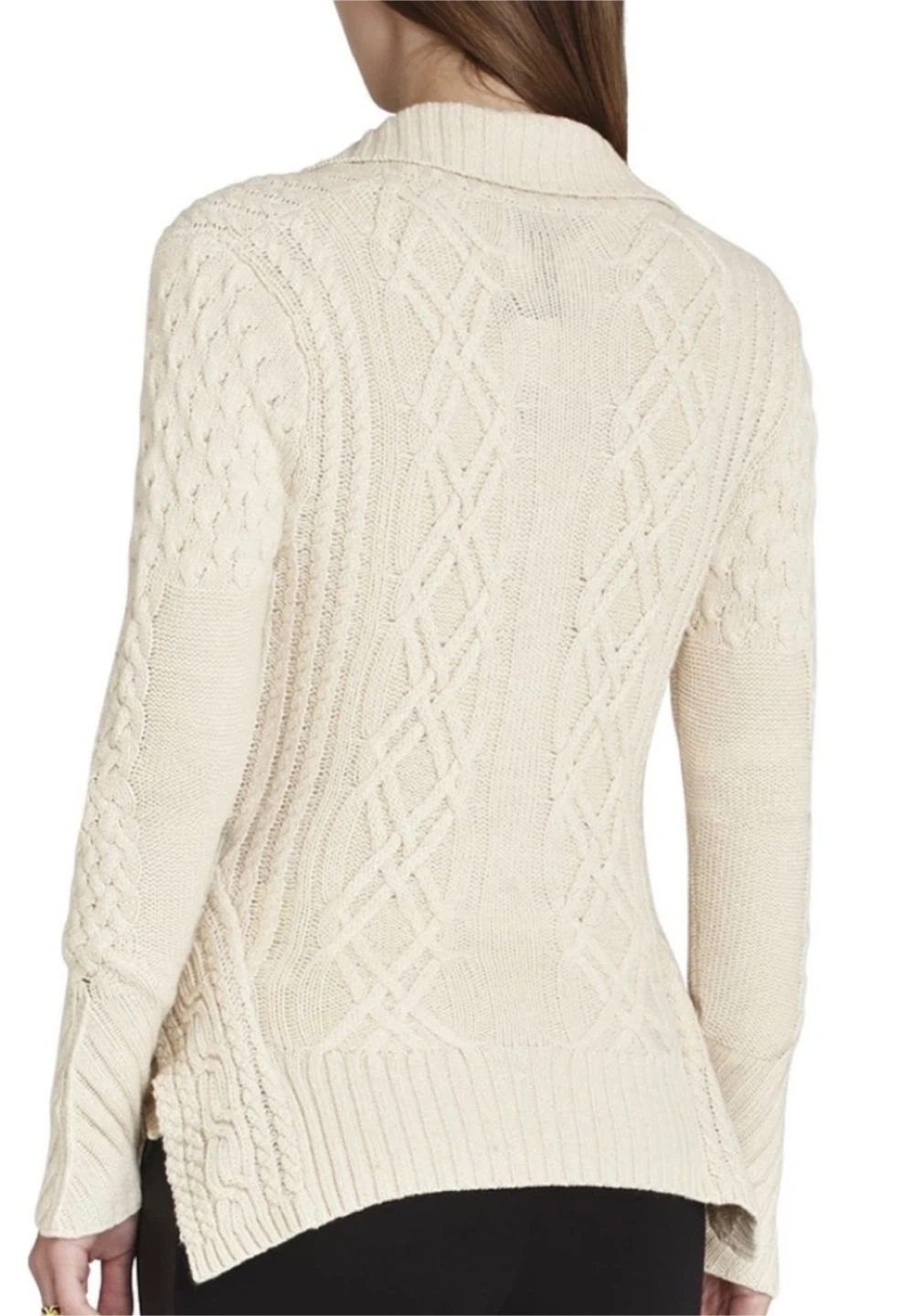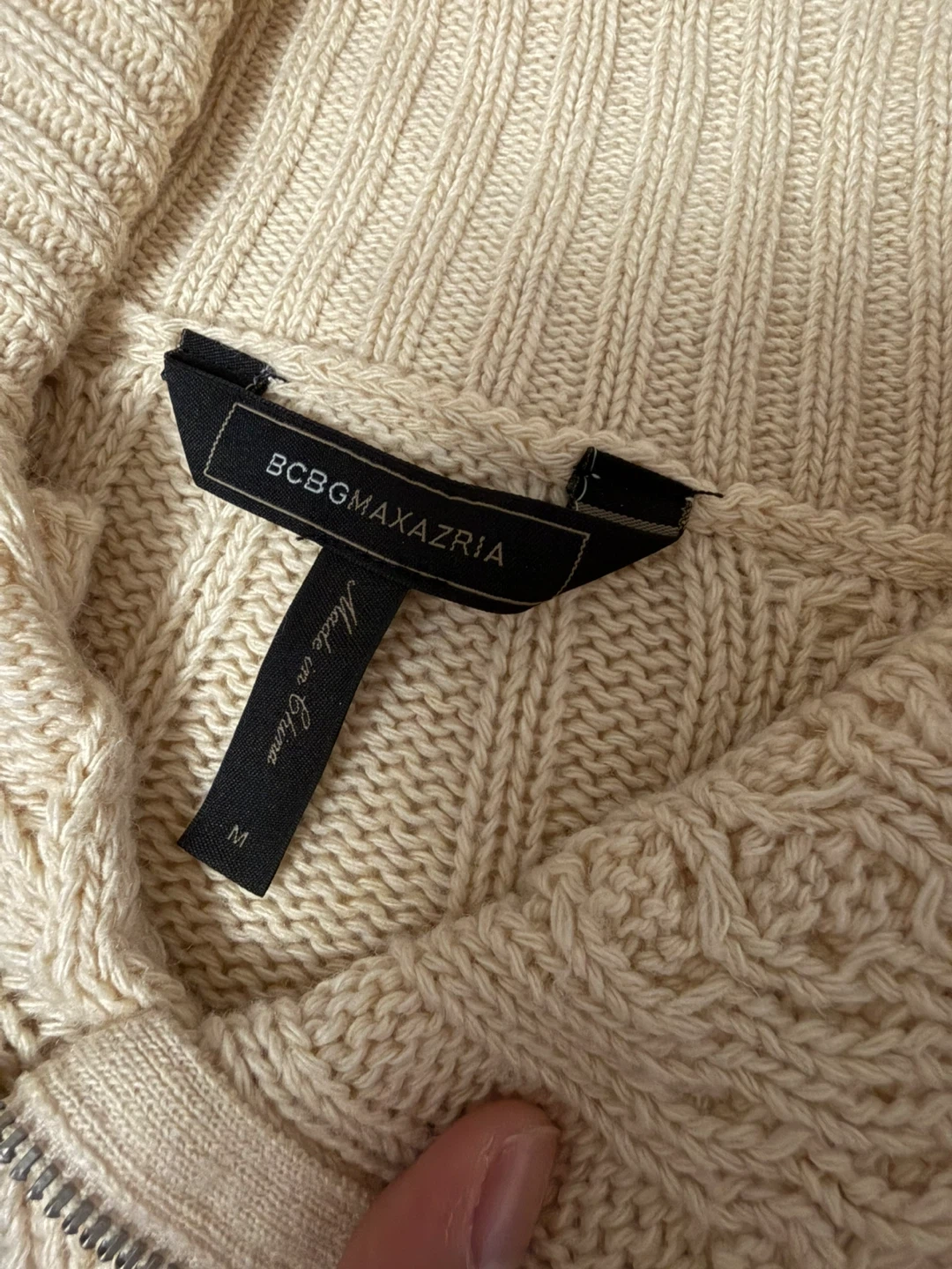 Cozy up in this BCBGMAXAZRIA Zanzi cable knit moto sweater! It's a beautiful cream colour and features a stylish asymmetrical hem. Size M. Perfect for layering or wearing on its own