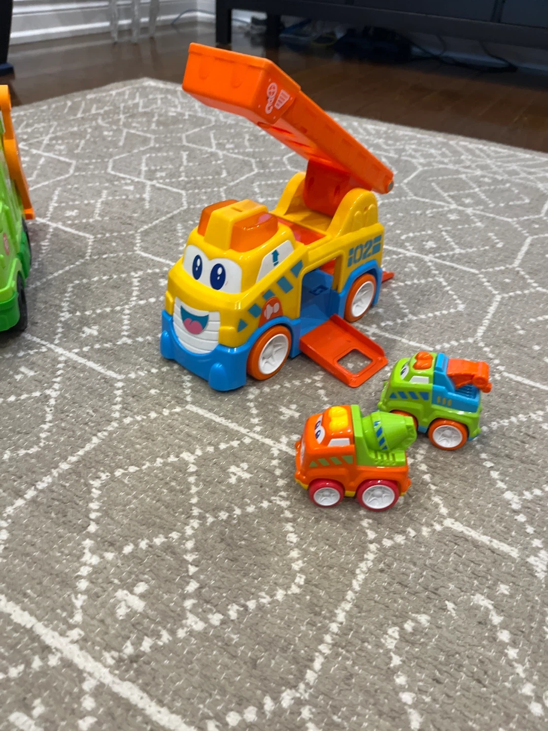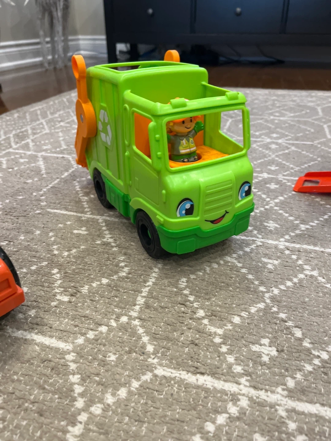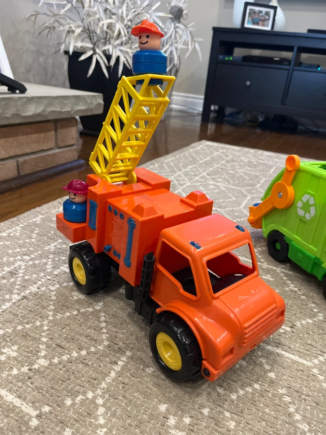 Set includes an orange fire truck with a ladder and figures, a green garbage truck with a figure, and a yellow tow truck with smaller trucks are made of durable plastic and designed for little hands.