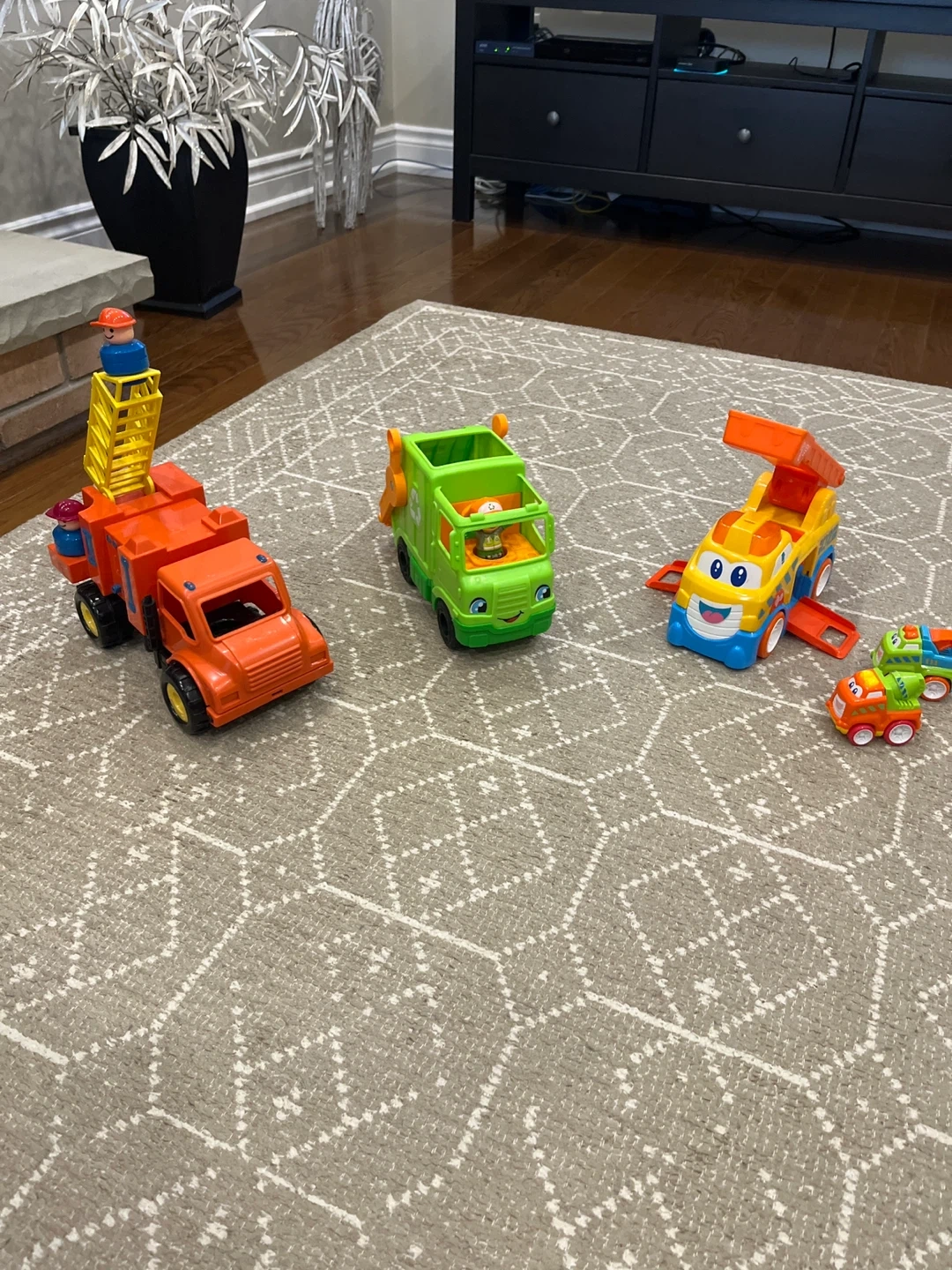 Set includes an orange fire truck with a ladder and figures, a green garbage truck with a figure, and a yellow tow truck with smaller trucks are made of durable plastic and designed for little hands.