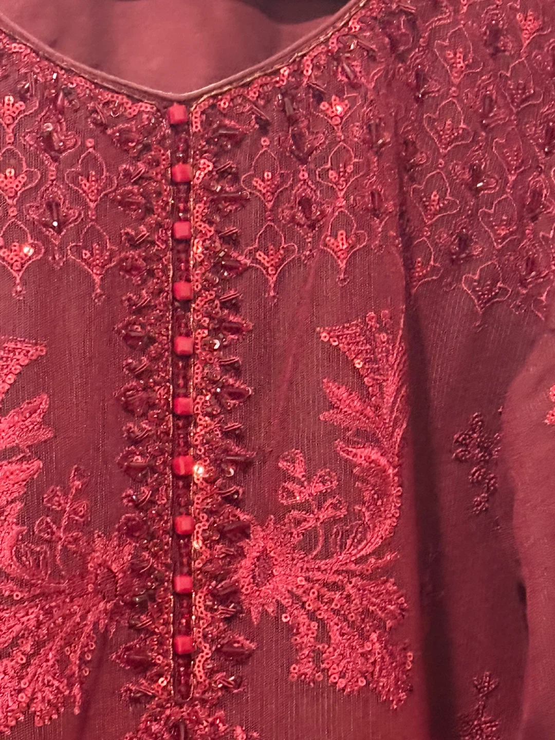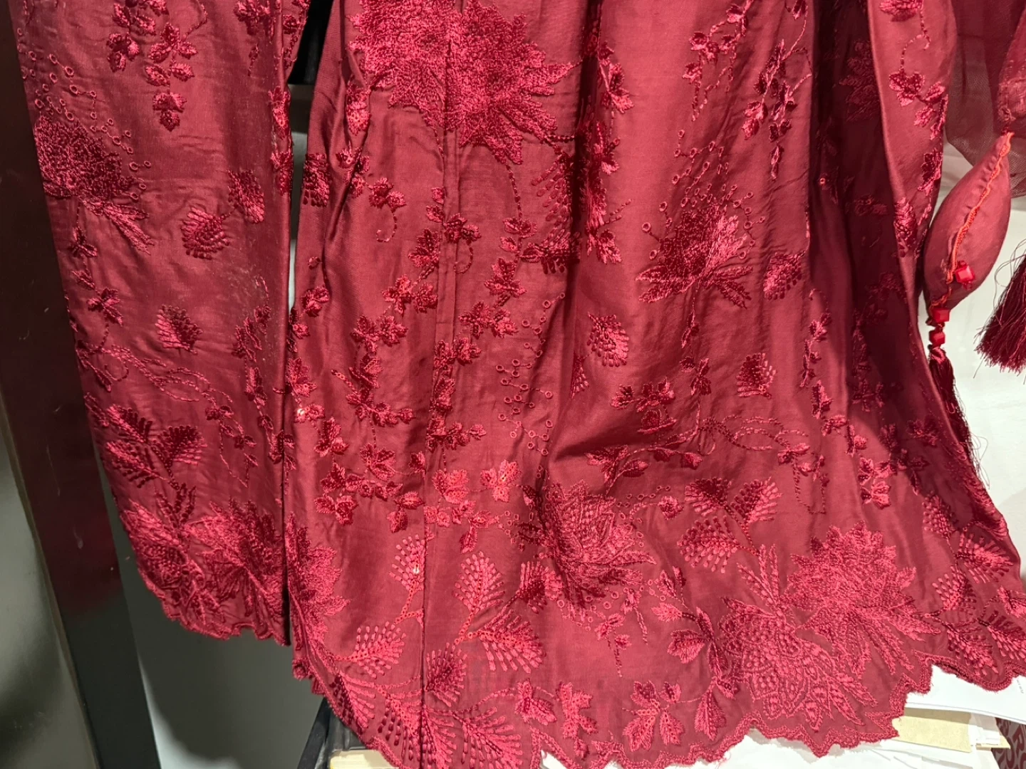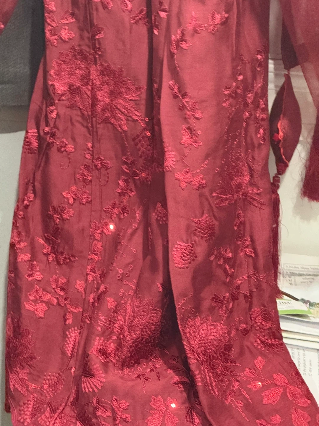 Beautiful red Sharara with stylish kameez with intricate embroidery. It's in great condition and ready for a new owner! The fabric has a subtle texture that adds to its elegance, perfect for special occasions.
