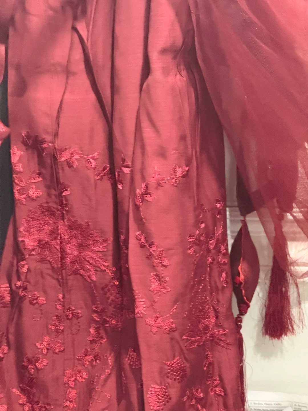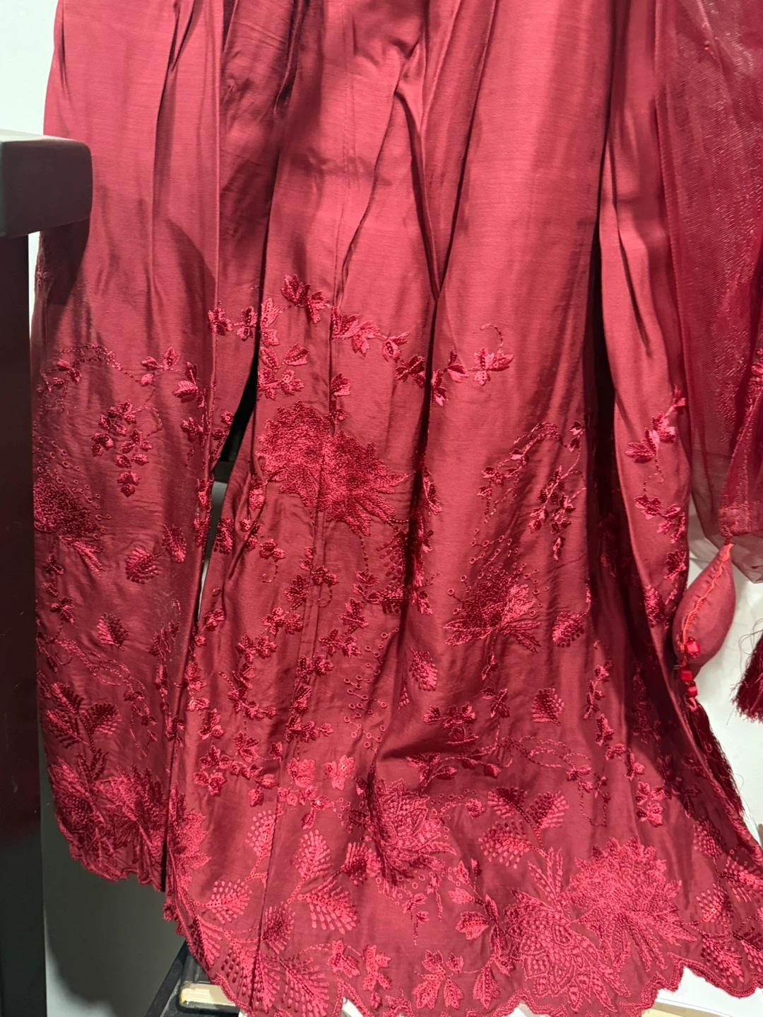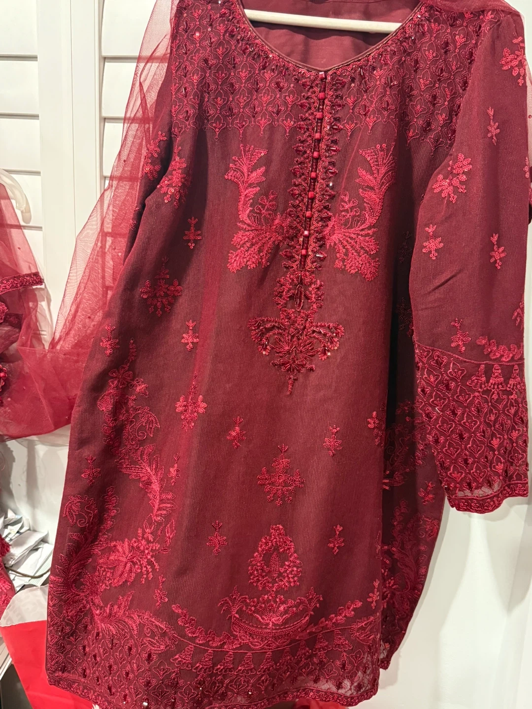 Beautiful red Sharara with stylish kameez with intricate embroidery. It's in great condition and ready for a new owner! The fabric has a subtle texture that adds to its elegance, perfect for special occasions.