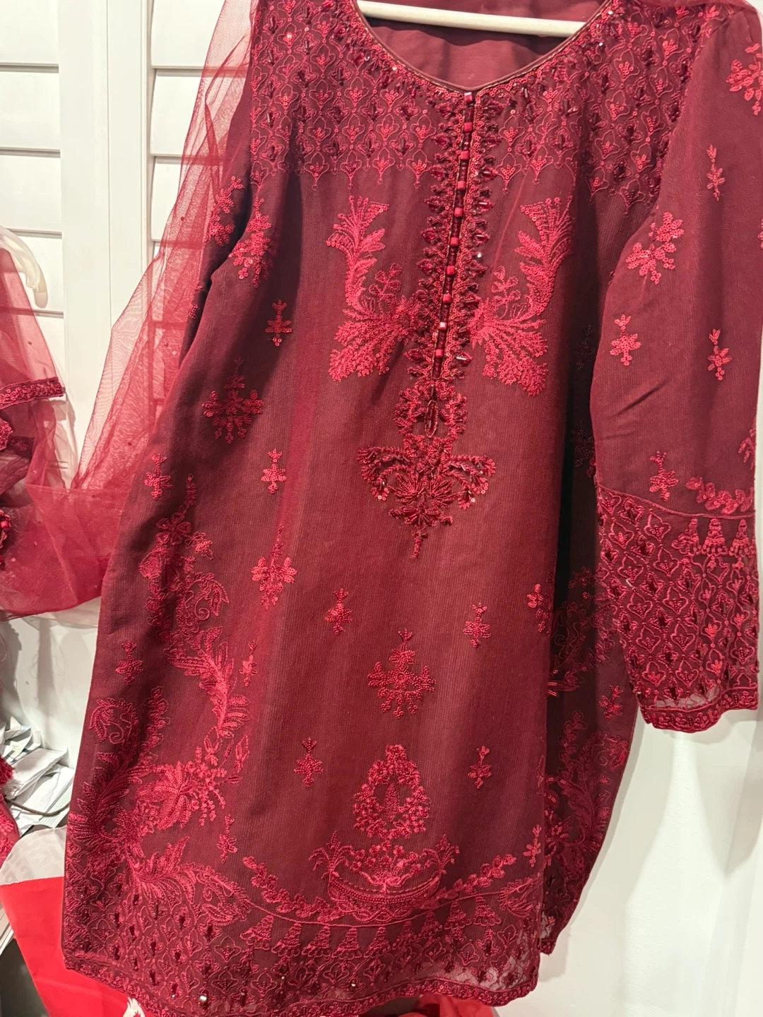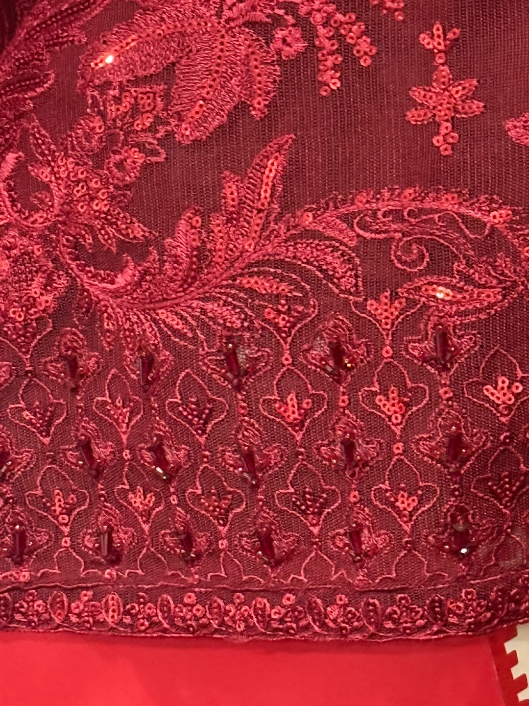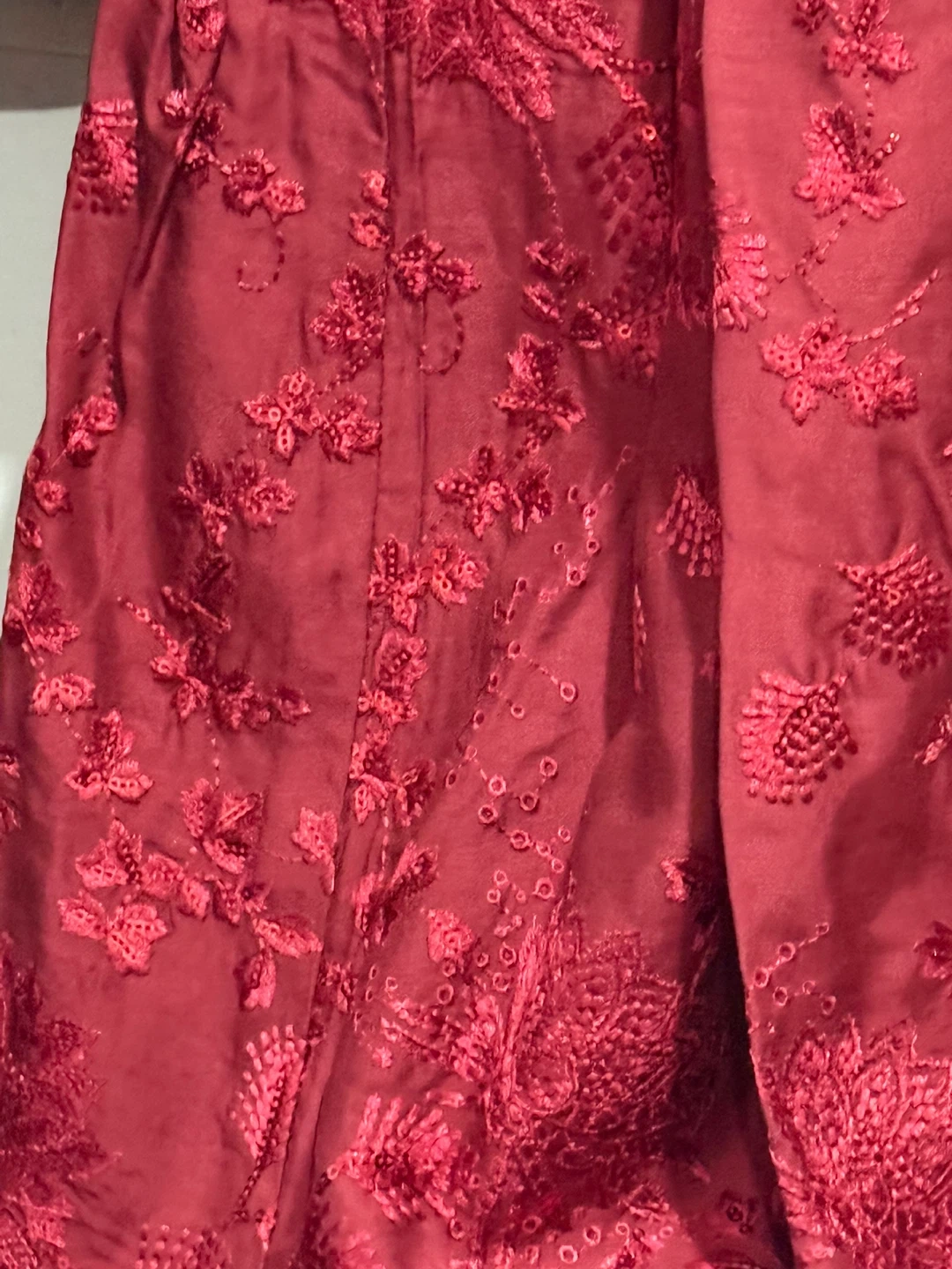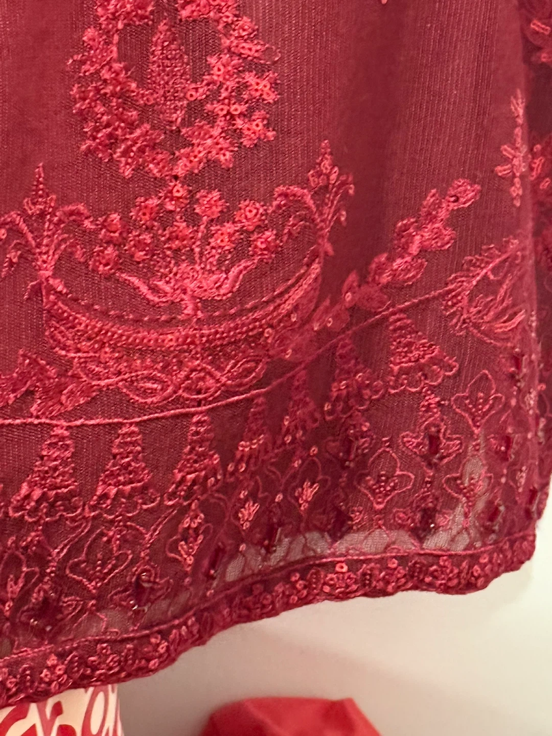 Beautiful red Sharara with stylish kameez with intricate embroidery. It's in great condition and ready for a new owner! The fabric has a subtle texture that adds to its elegance, perfect for special occasions.