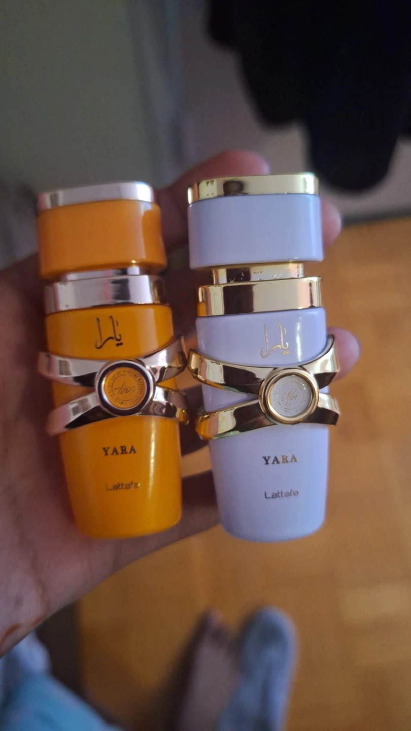 Two Lattafa Yara Eau de Parfum Natural Spray bottles, one orange and one white. Each bottle contains 6 ML or 0.16 FL OZ of perfume. It's perfect for trying out different scents. Makes a nice gift! 10 each