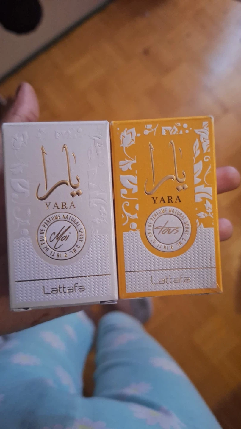 Two Lattafa Yara Eau de Parfum Natural Spray bottles, one orange and one white. Each bottle contains 6 ML or 0.16 FL OZ of perfume. It's perfect for trying out different scents. Makes a nice gift! 10 each