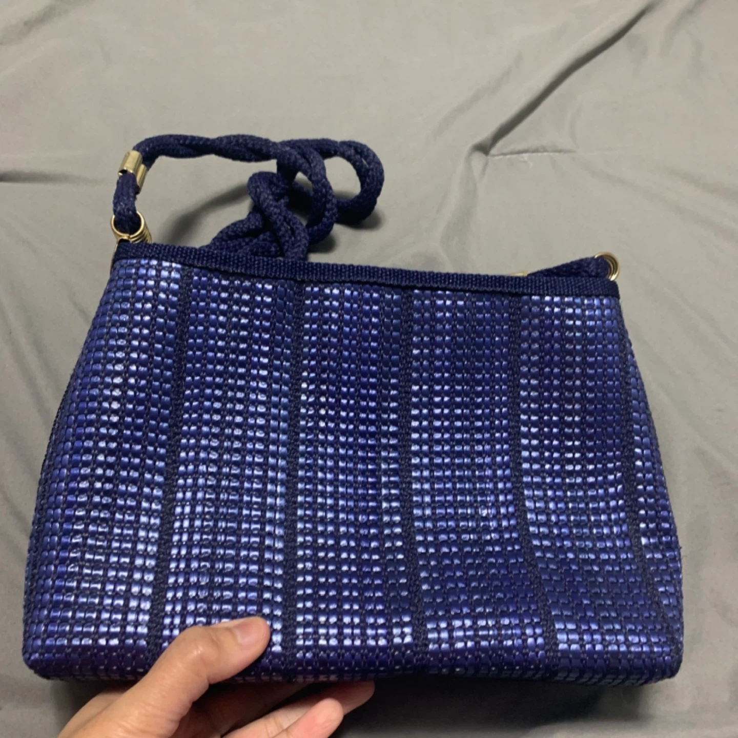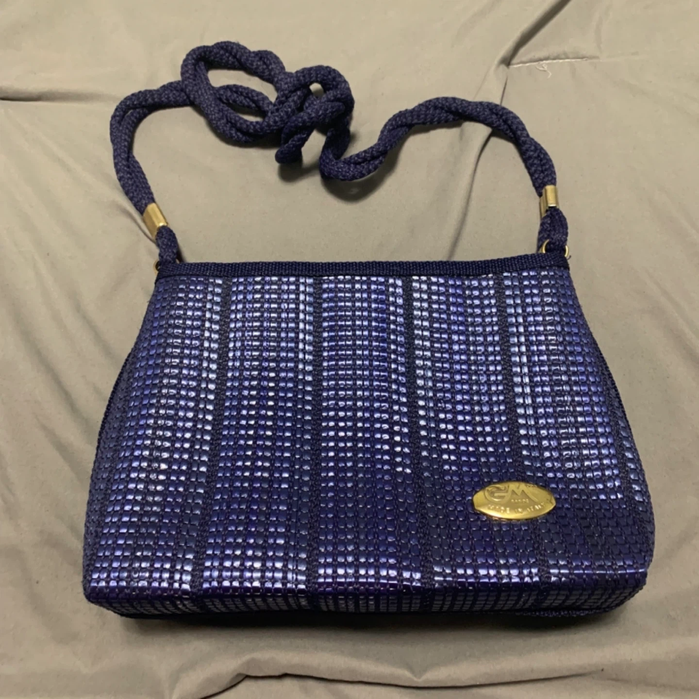 This is a blue woven shoulder bag from EM MODE Milano. It's made in Italy and features a braided strap and gold-toned hardware. The woven texture has a subtle shimmer.