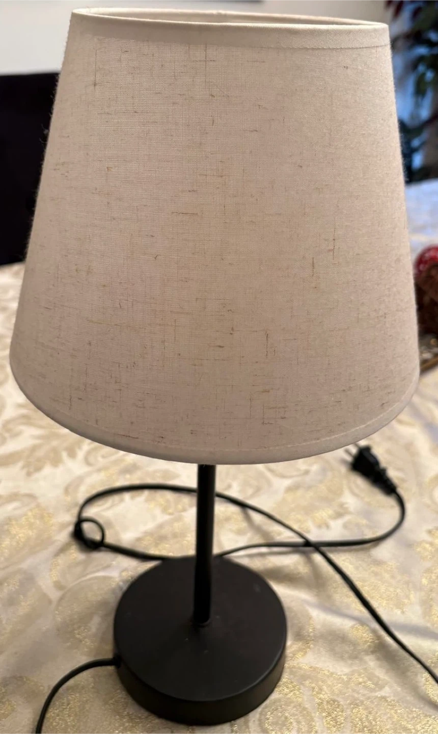 This is a small table lamp with a beige fabric shade and a black base. It's powered by a cord with an inline switch. The shade is conical in shape.
