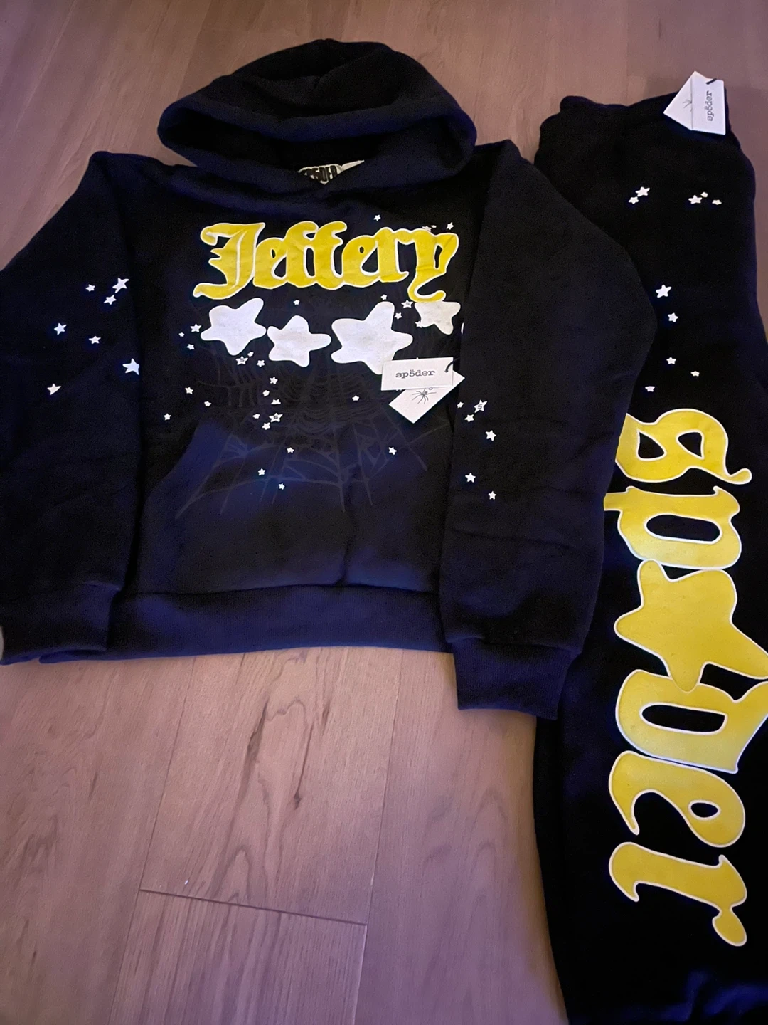 Black Spider tracksuit set. Includes a hoodie and sweatpants. Both pieces feature white star detailing and the 'Spider' graphic on the pants. Made from a cotton blend material.