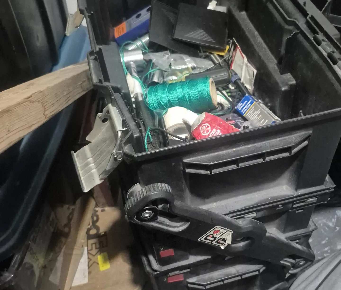 This black plastic toolbox contains various hardware items. It's made of durable plastic. Useful for storing and organizing tools and small parts.