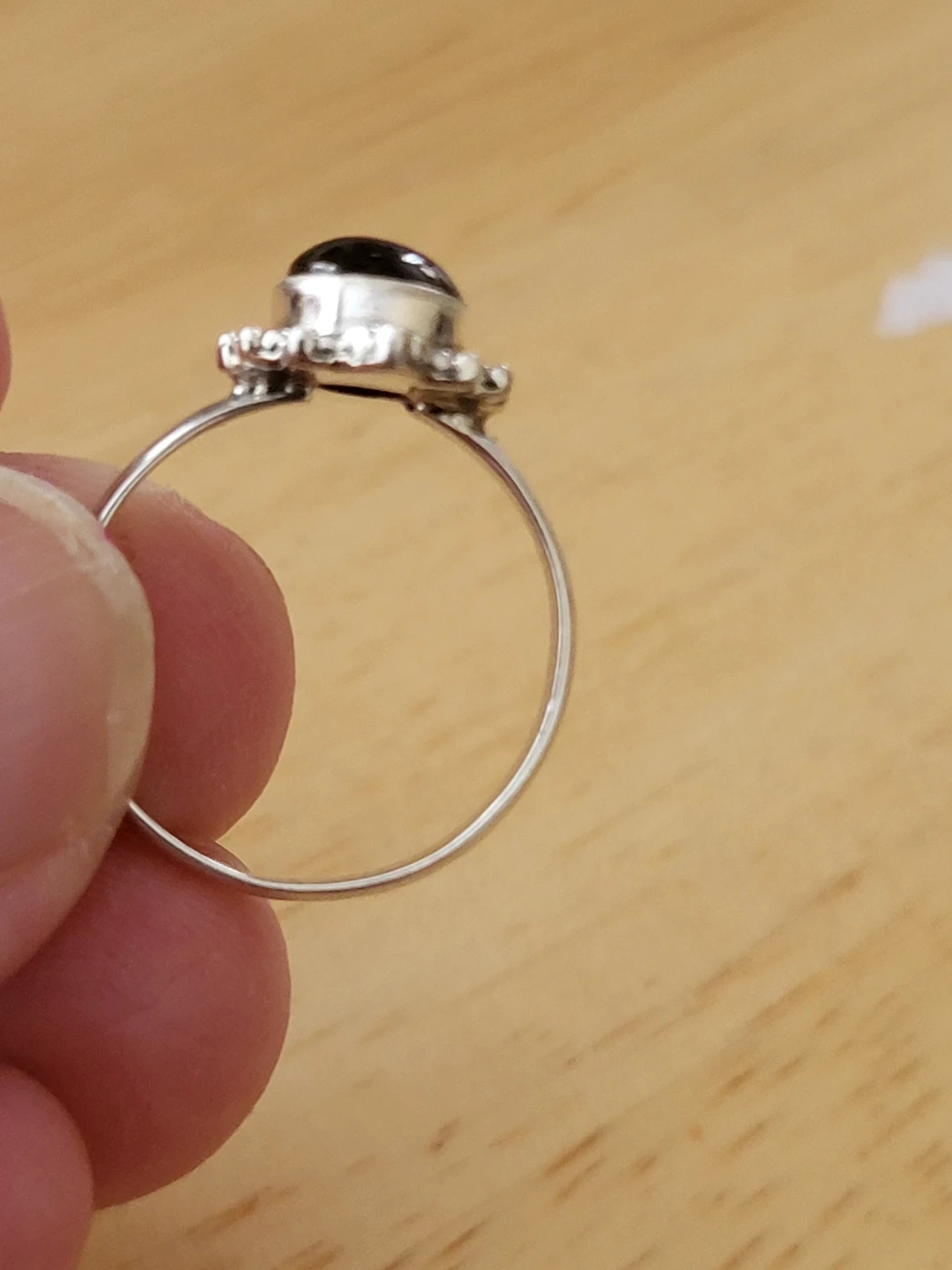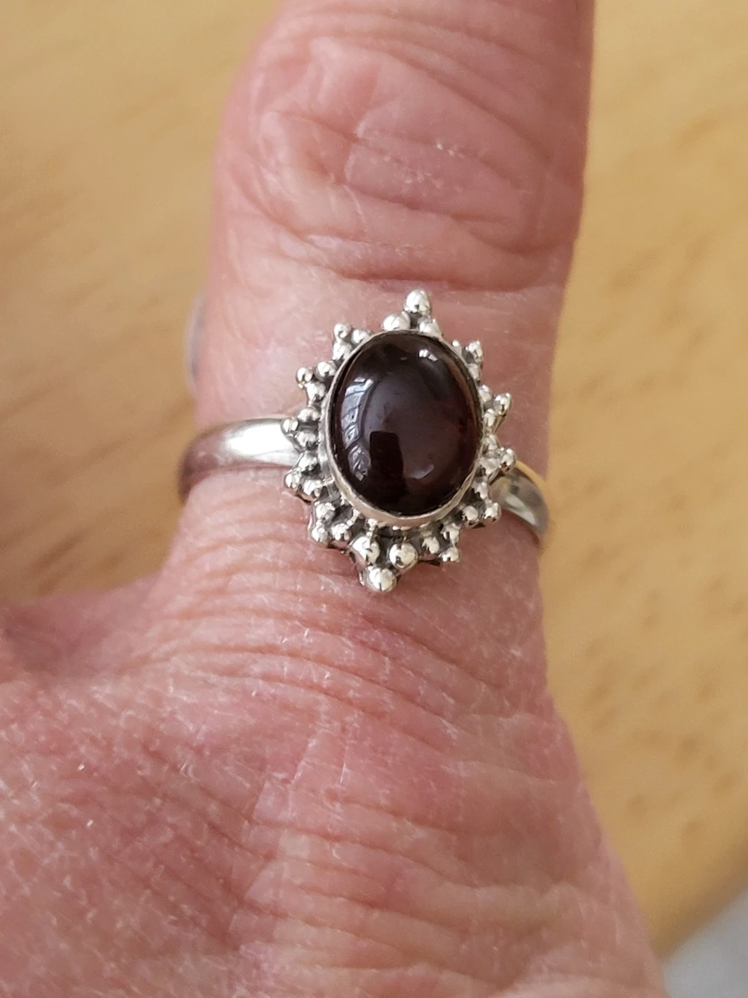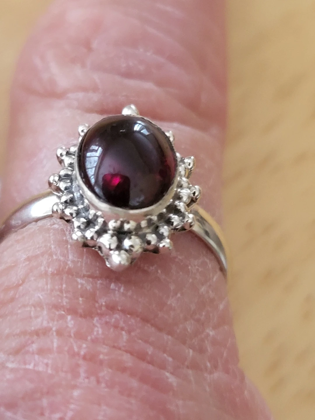 This is a ring stamped with "925", indicating sterling silver. It has a decorative setting around a beautiful genuine garnet stone. Sterling silver is known for its durability and shine.