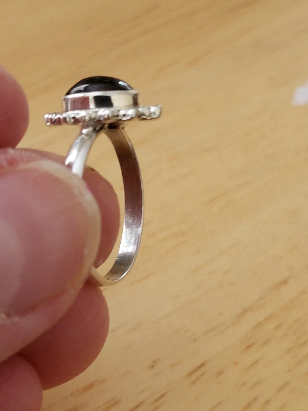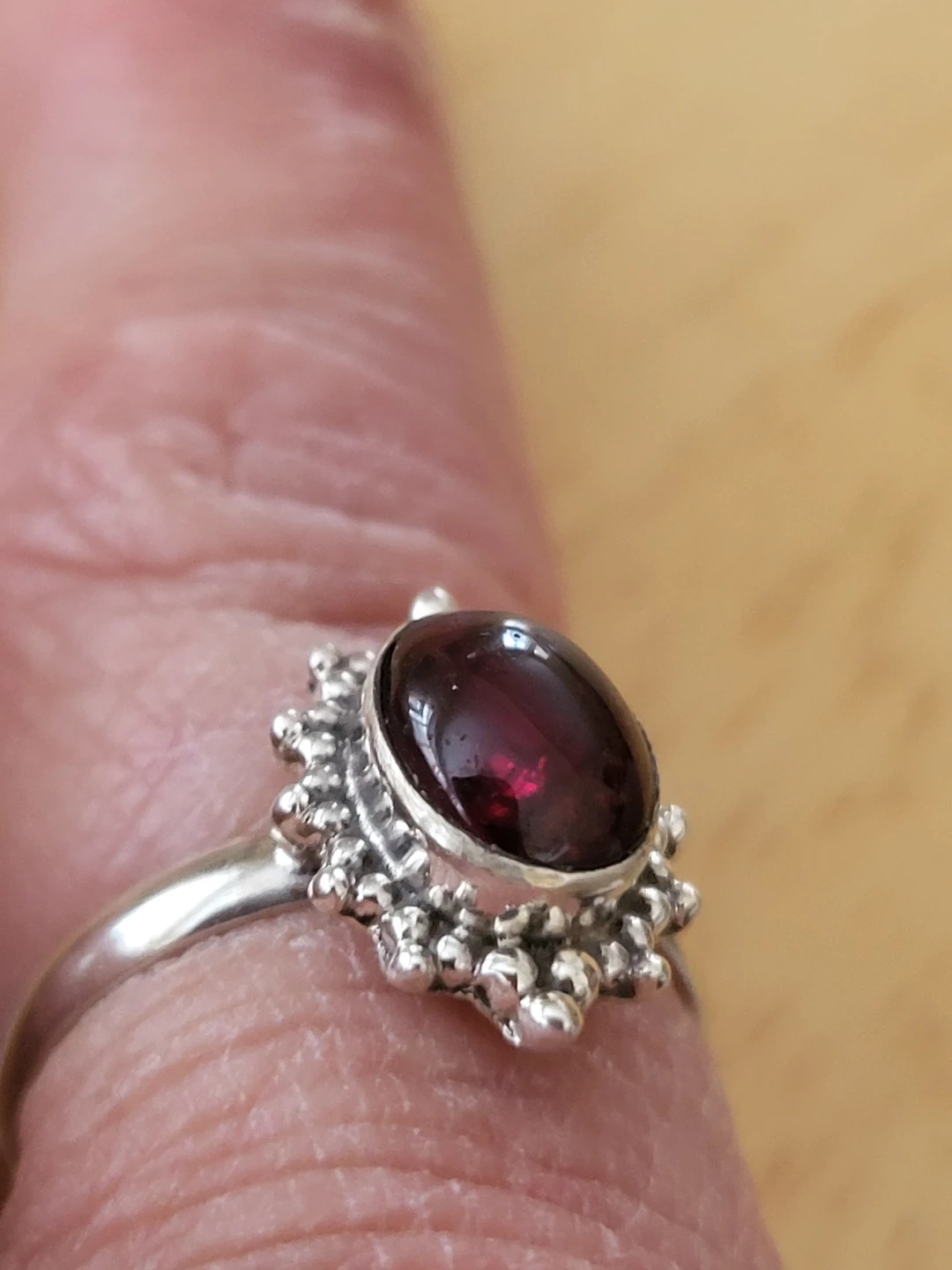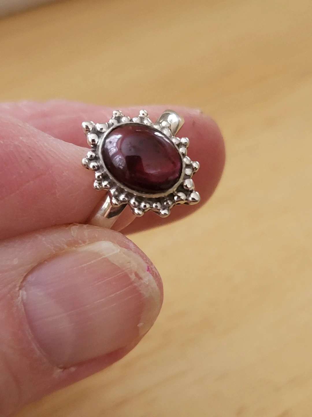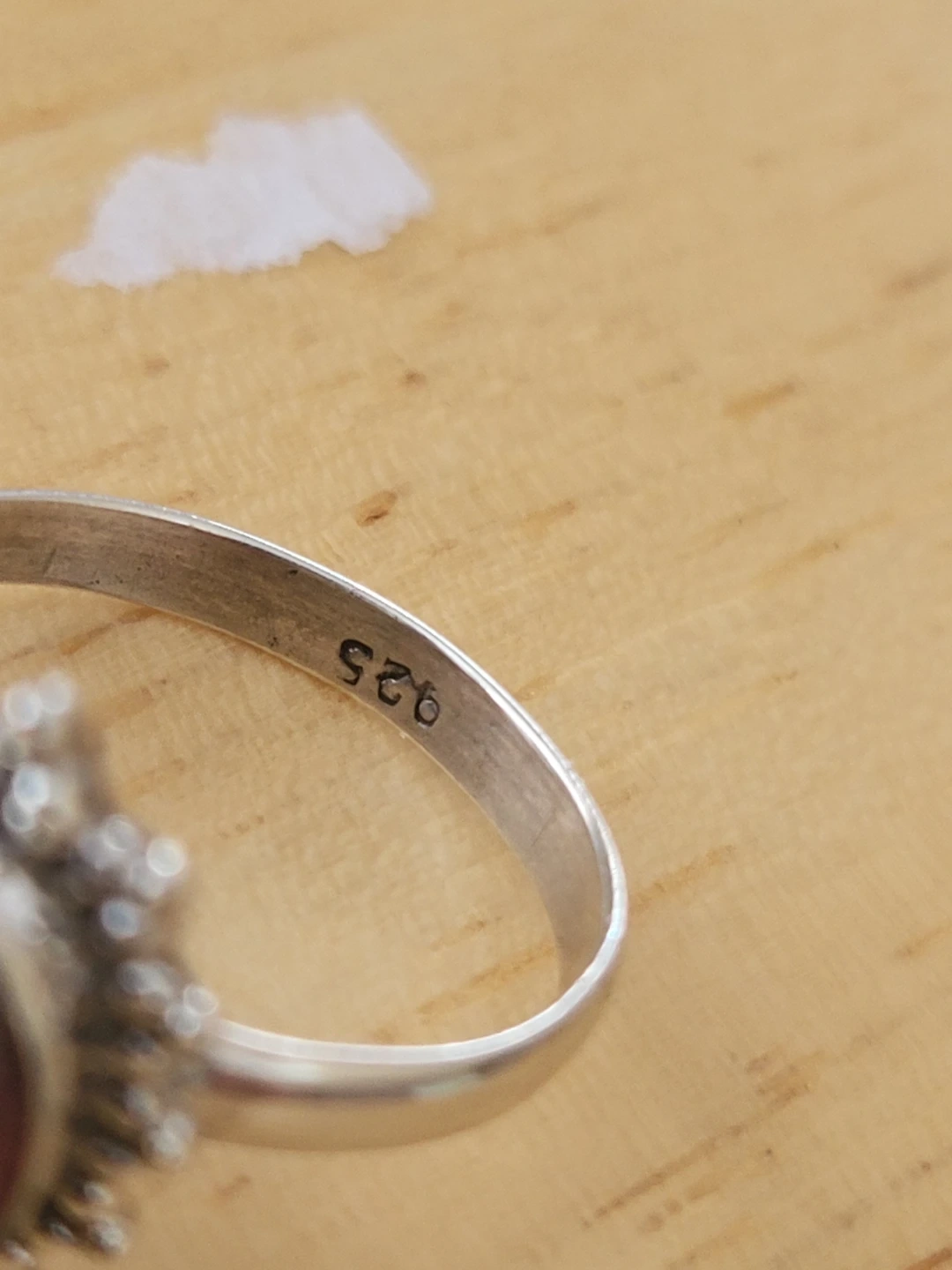 This is a ring stamped with "925", indicating sterling silver. It has a decorative setting around a beautiful genuine garnet stone. Sterling silver is known for its durability and shine.