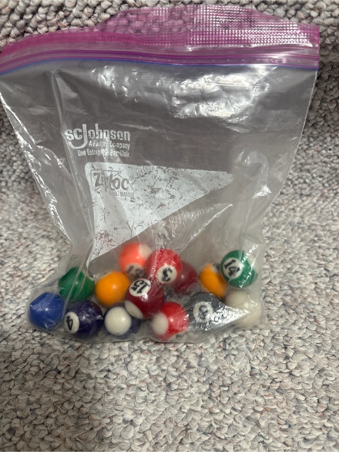 A bag of mini pool balls for a table game. Includes various numbered balls like 1, 3, 4, 14, and 15. These balls are great for a tabletop pool game or as replacements. Pick up cash only