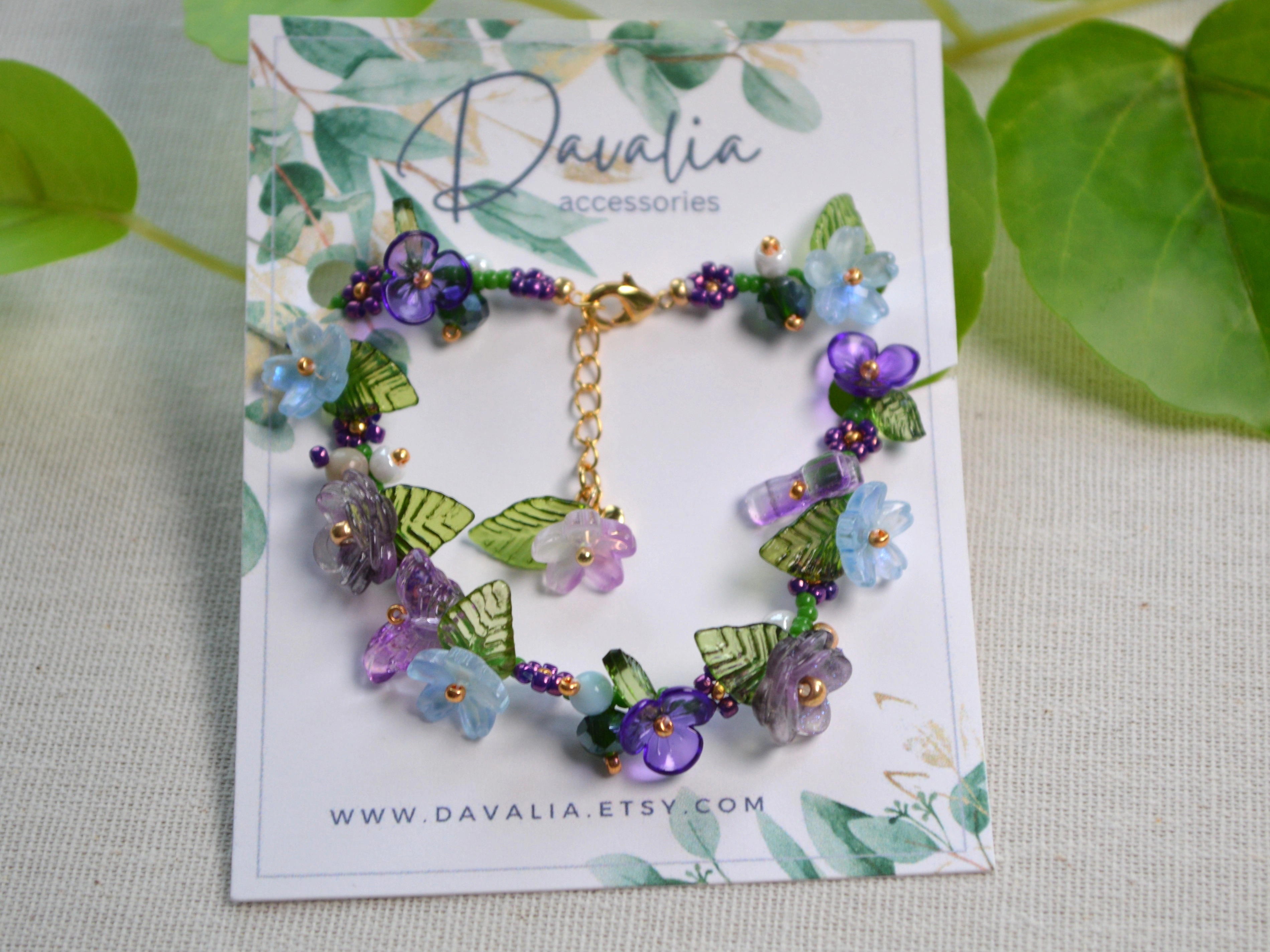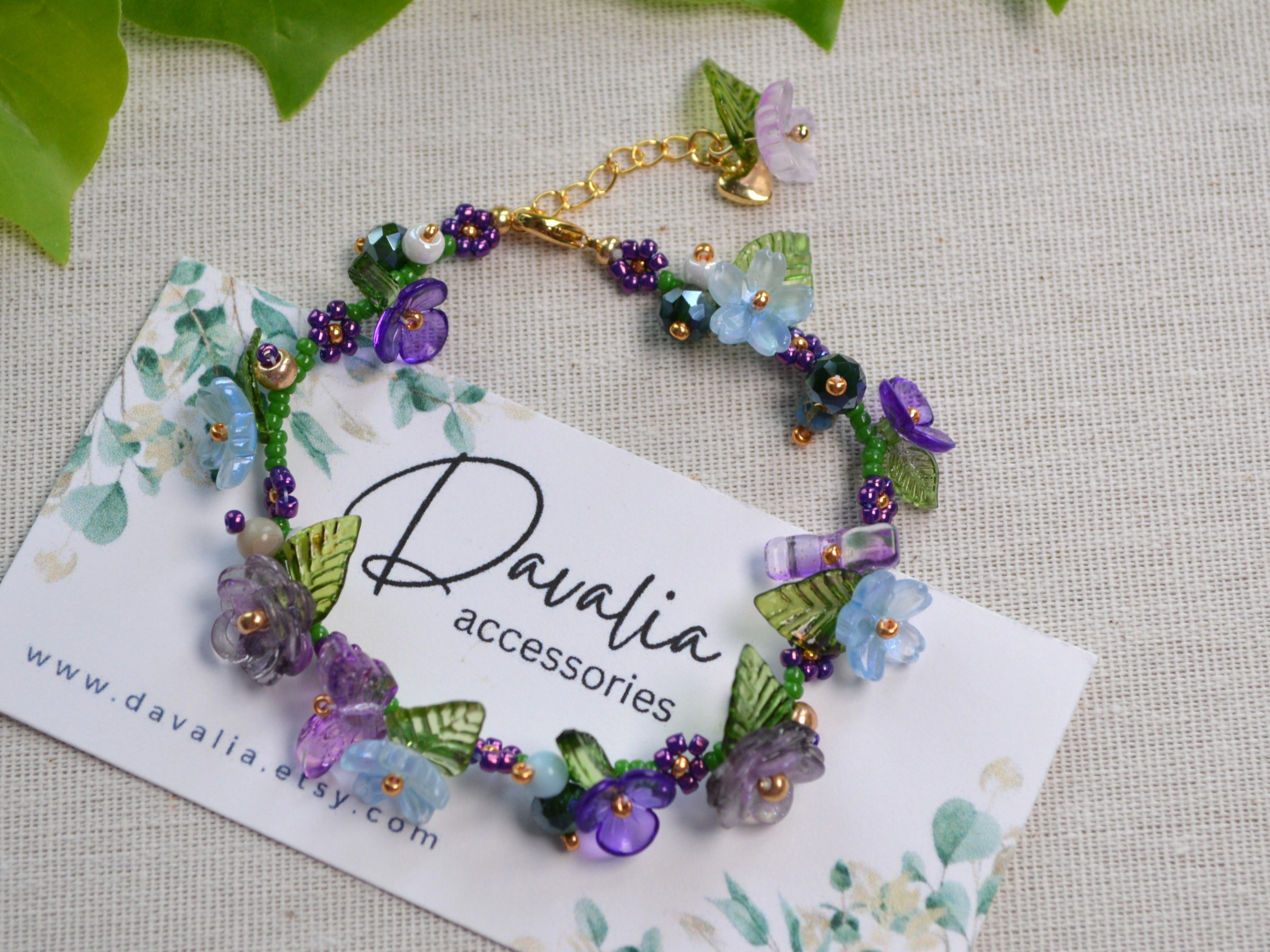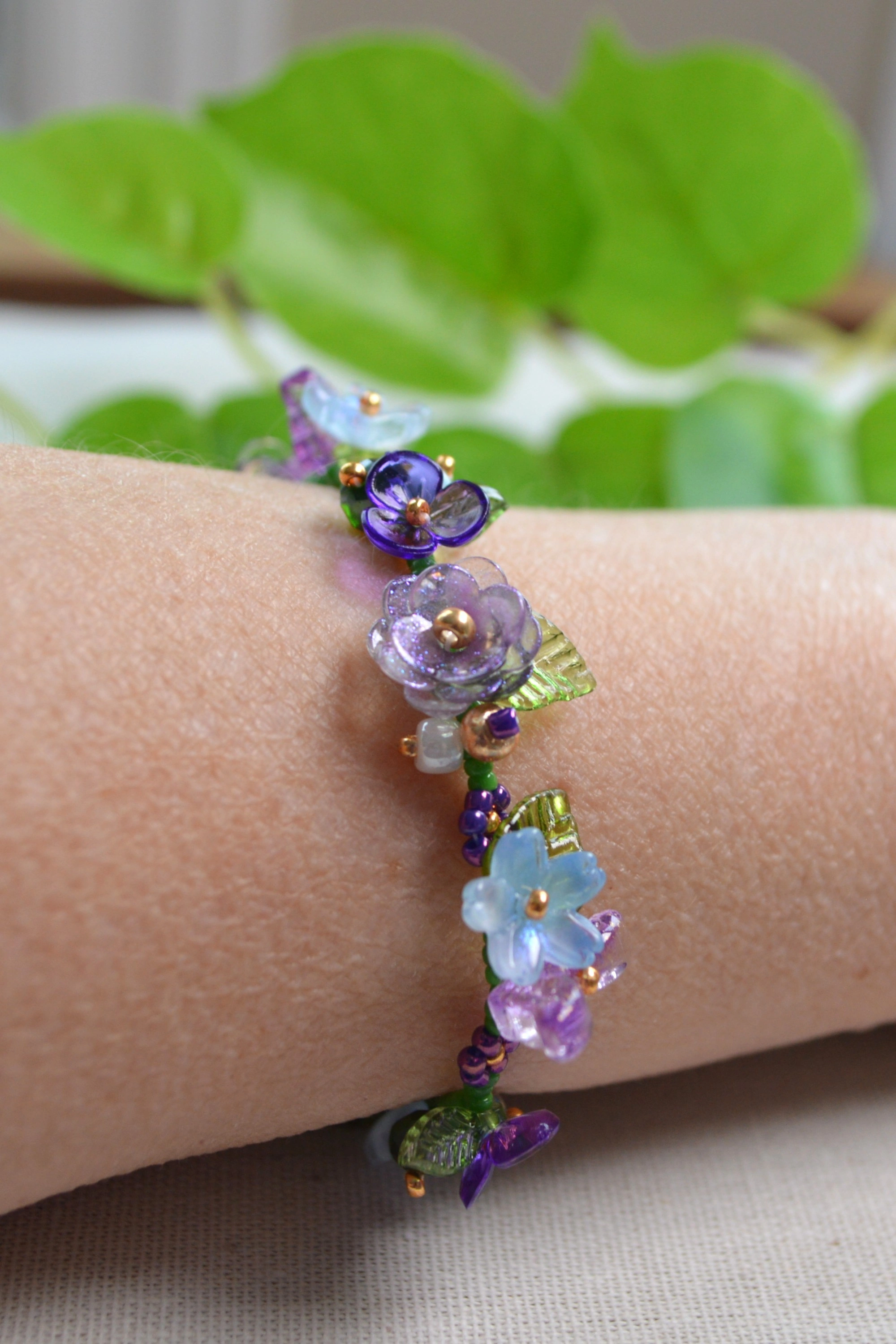 This unique bracelet features a mix of purple, blue and gold tones, with floral and butterfly accents and small green leaves. Made by hand using seed beads, glass, and acrylic flowers and leaves. A soft, nature-inspired piece that’s perfect for everyday wear.