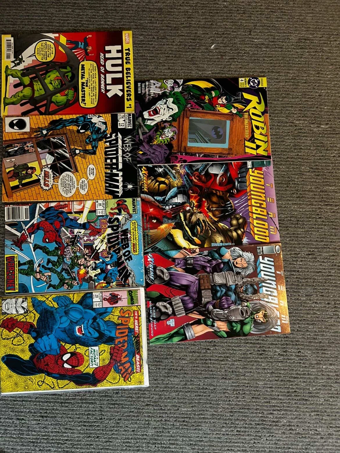 This is a lot of various Marvel and DC comic books. Includes X-Men, X-Force, X-Factor, Spider-Man, Justice League, and DC Connect titles. Issues vary from the 1990s and early 2000s, with some newer DC titles from 2023. A great collection for any comic fan!