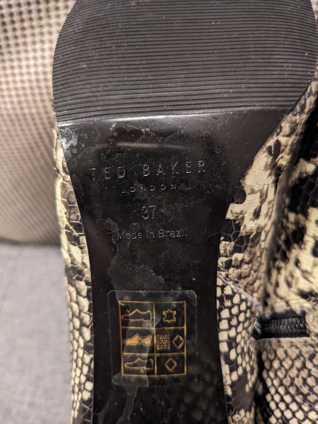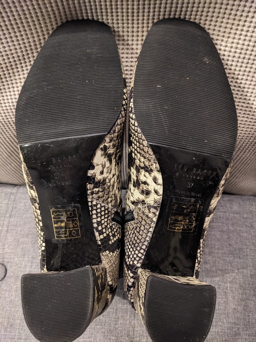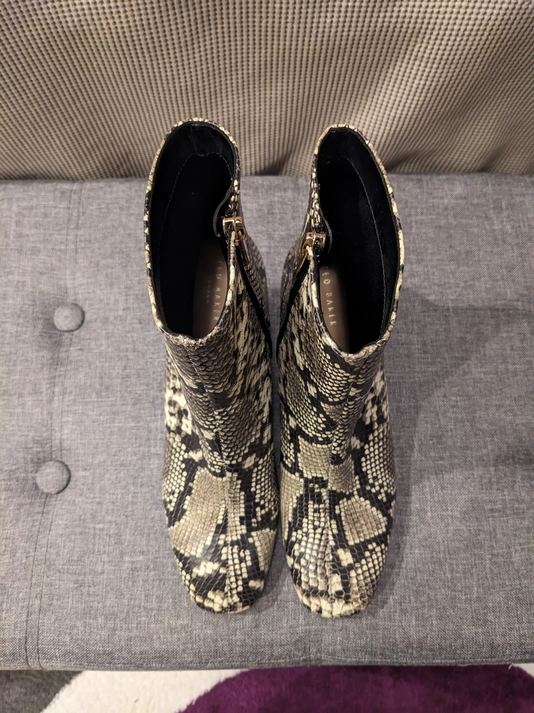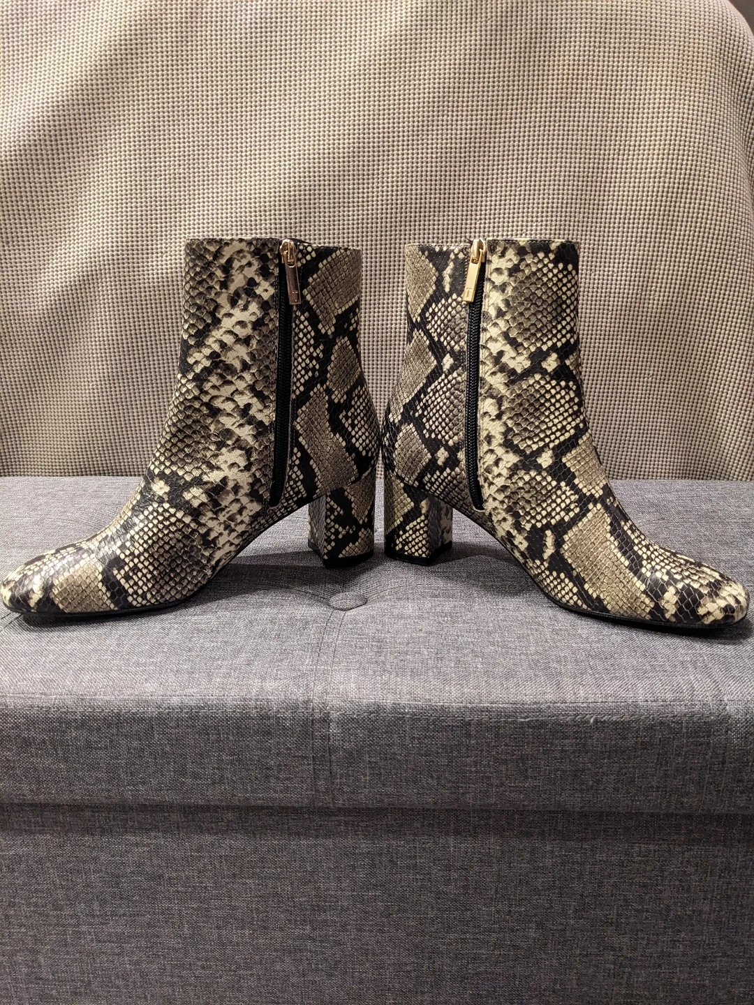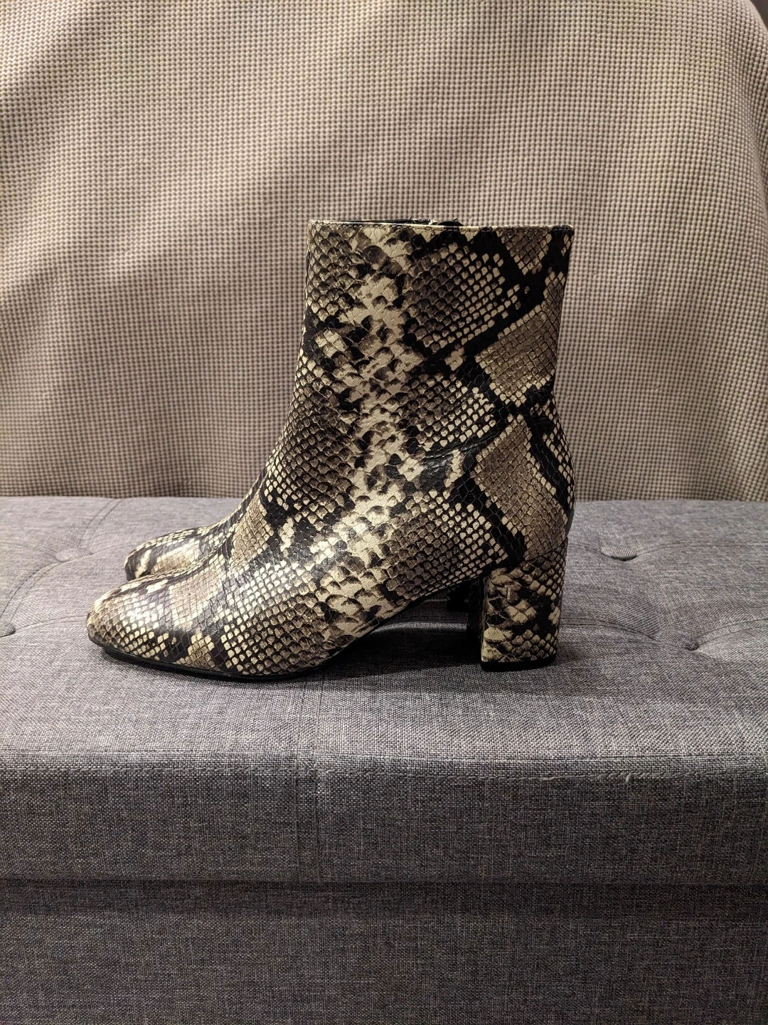 Ted Baker size 7 ankle boots with a trendy snake print design. These feature a stylish block heel and a side zipper for easy on and off.
