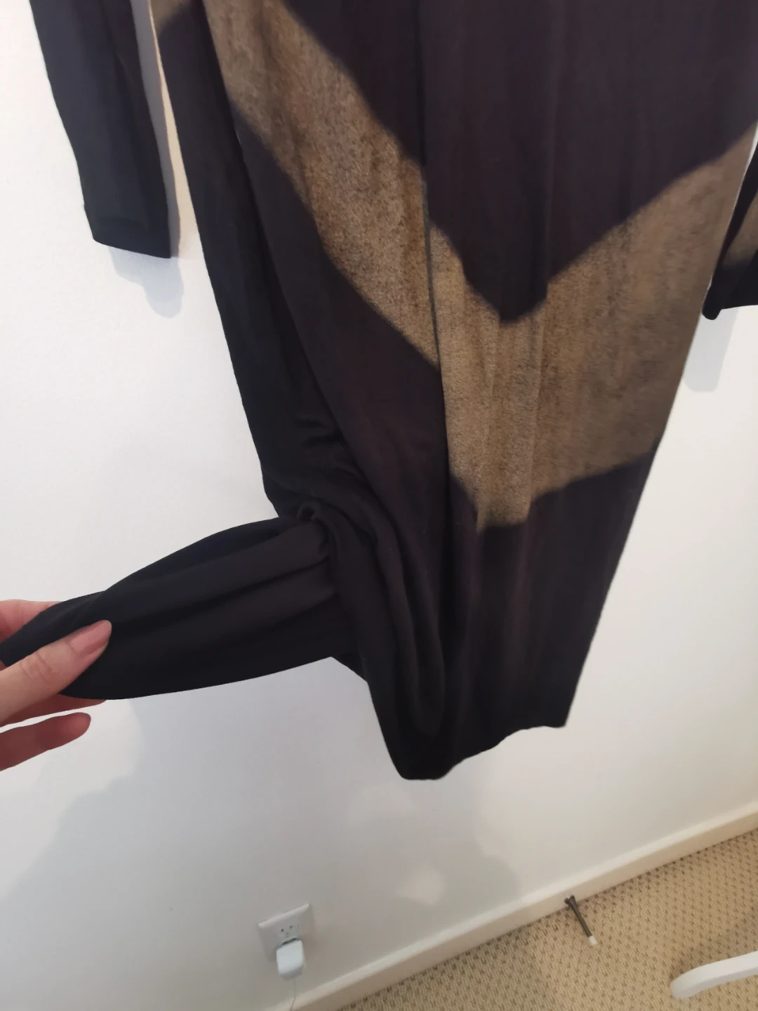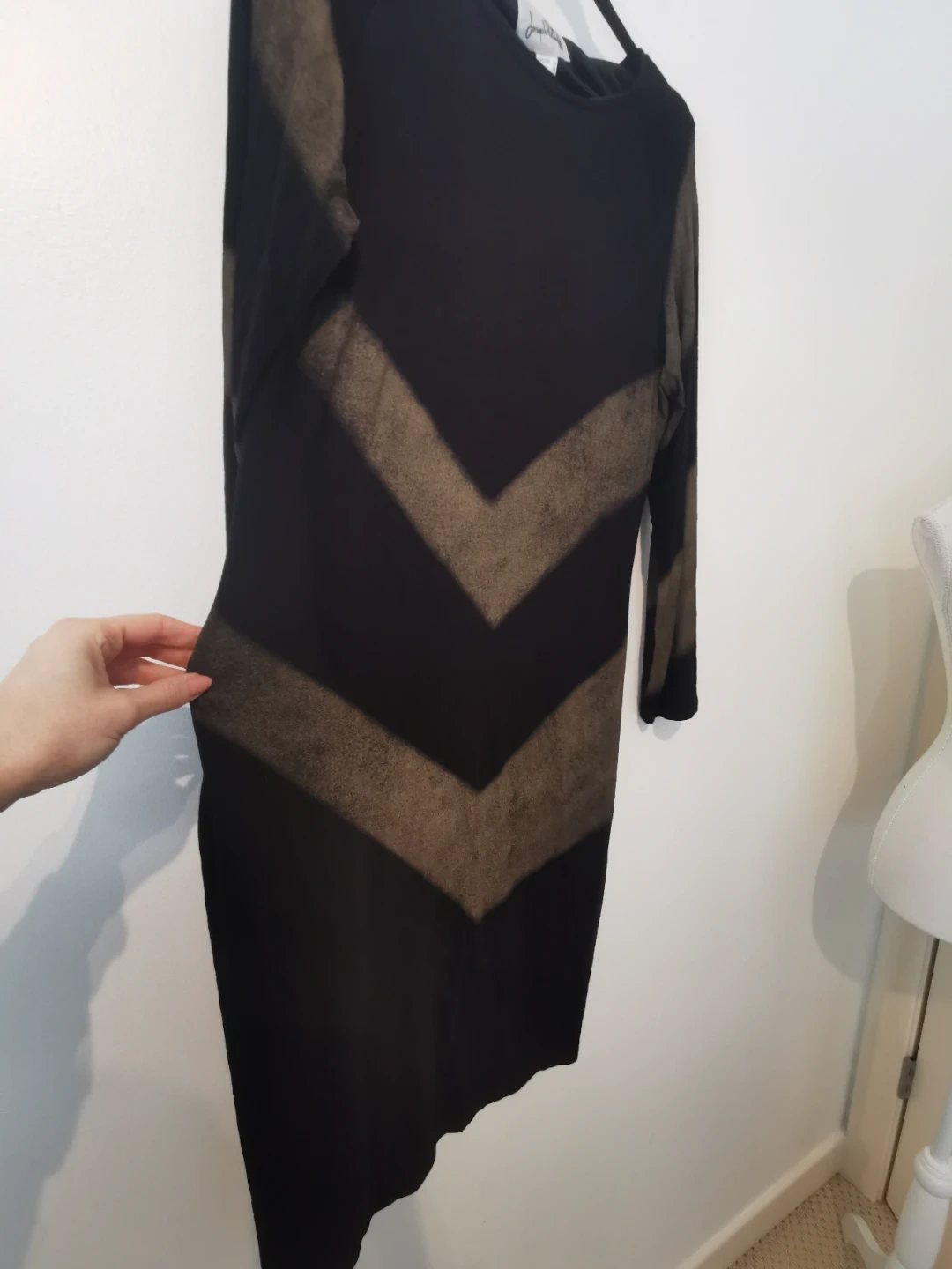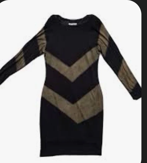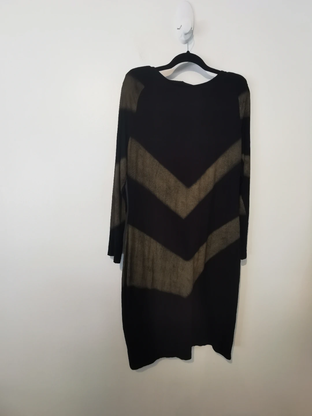 Joseph Ribkoff long-sleeved black dress with a striking olive green chevron pattern. Size 14 (CAN/USA). It's made of a stretchy, comfortable fabric.