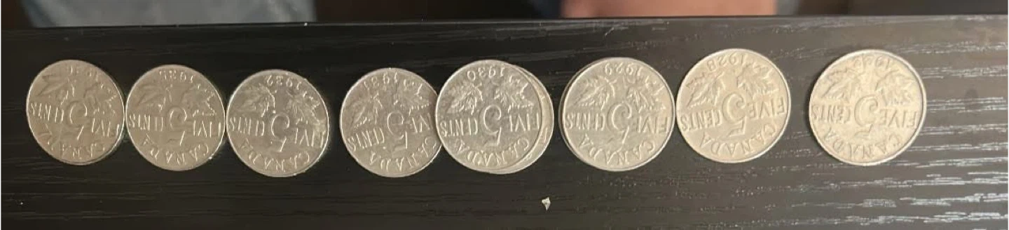 I have a collection of vintage Canadian five-cent coins from the late 1920s and early 1930s. They feature the classic maple leaf design. A great addition to any coin collection!