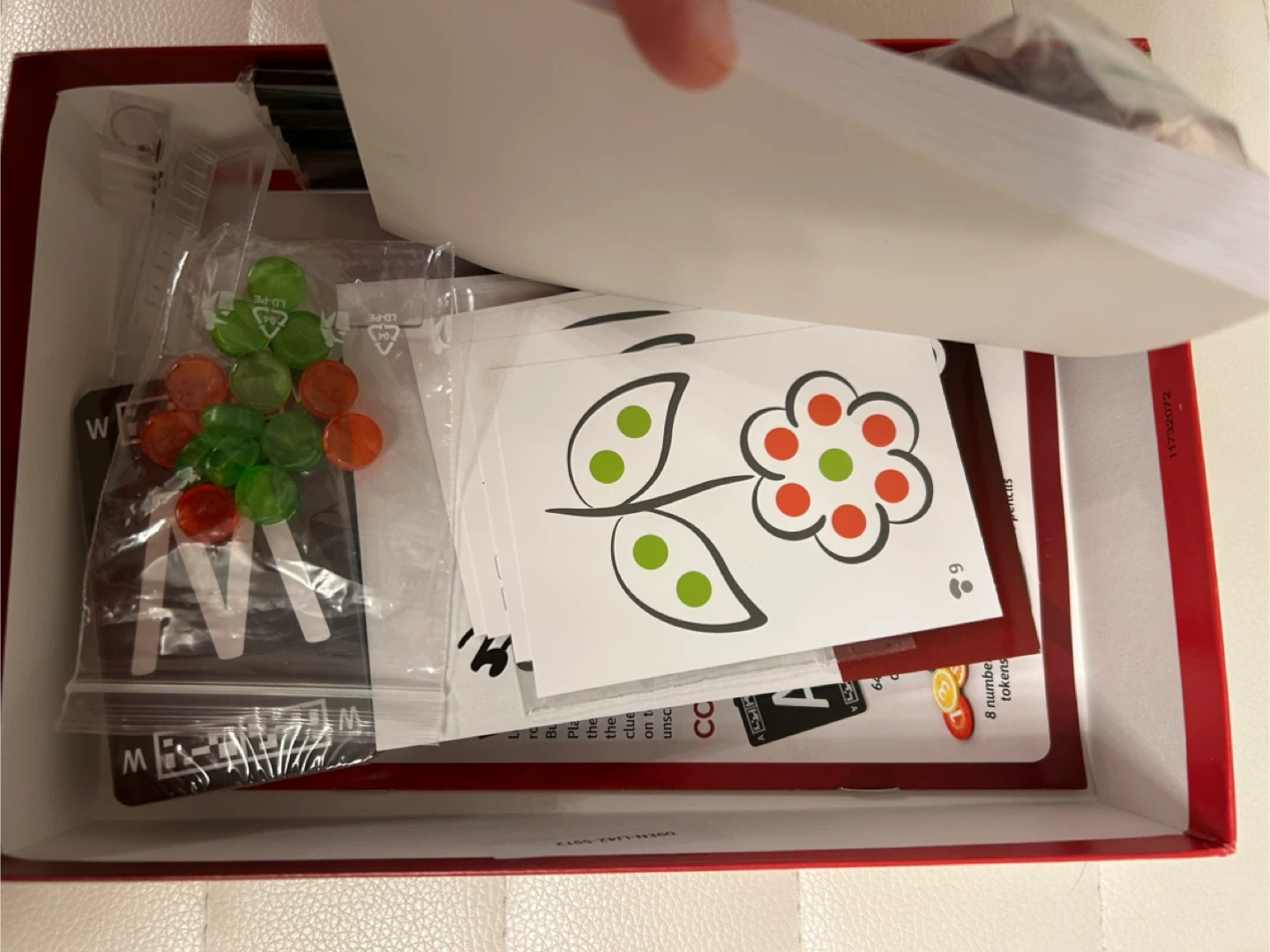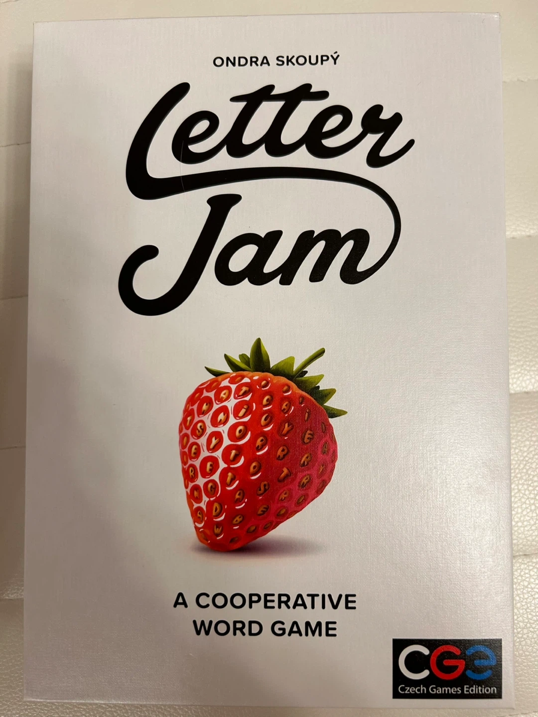 This is the cooperative word game Letter Jam. It includes 64 letter cards, 1 wildcard, 8 weighted poker chips, 6 red tokens, 9 green tokens, 8 card stands, 10 pencils, 4 pad of guessing sheets, 4 setup cards, and 1 rulebook. It's a fun game for 2-6 players and takes about 45 minutes to play.