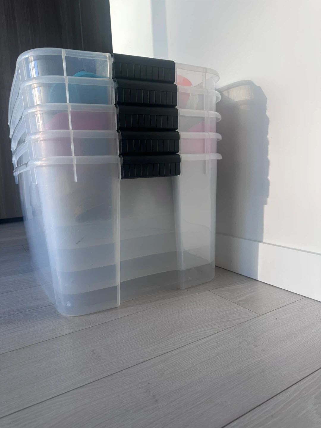This is a Sterilite 110 L storage container with plastic lids. It's part of the Ultra Latch line. Dimensions are 33" L x 20.5" W x 13.5" H. It's made of clear plastic with white latches.