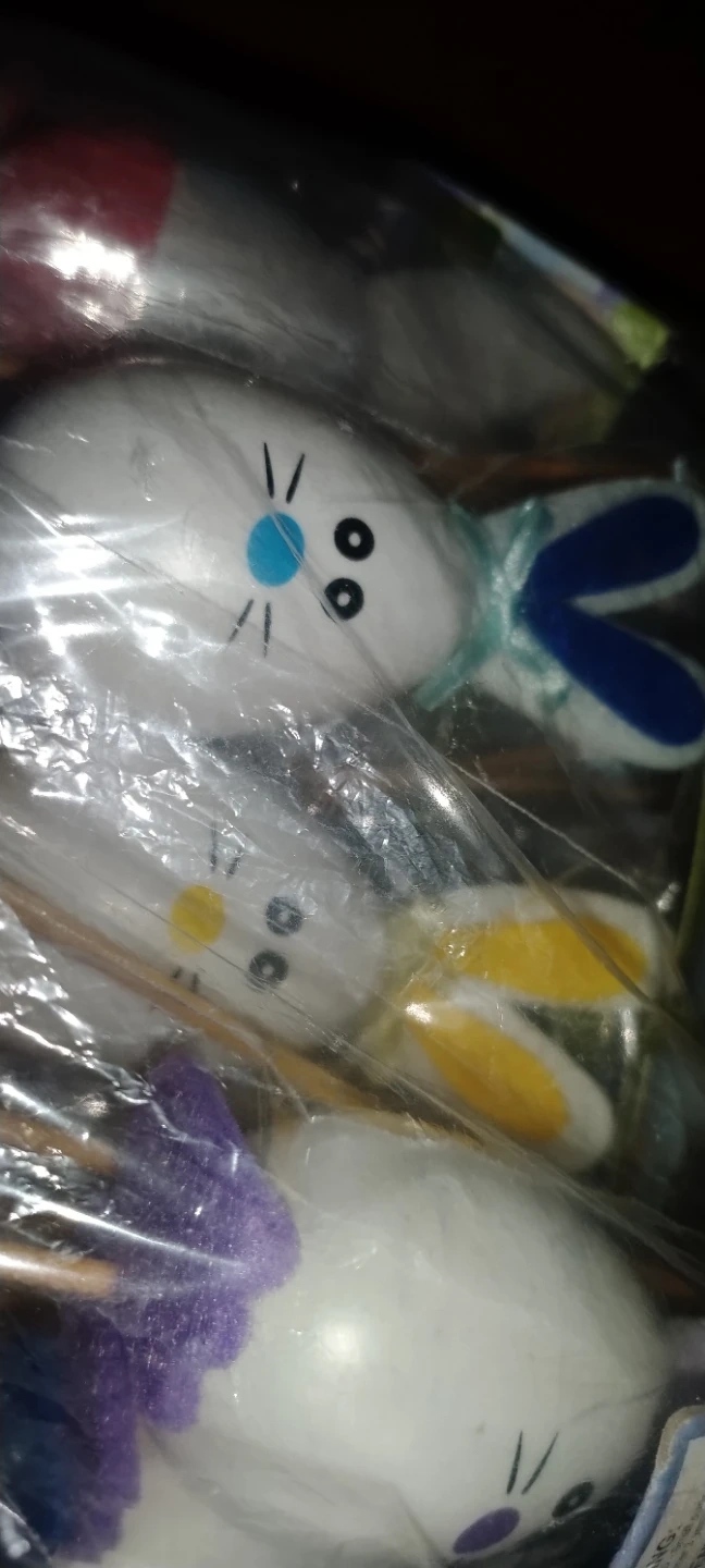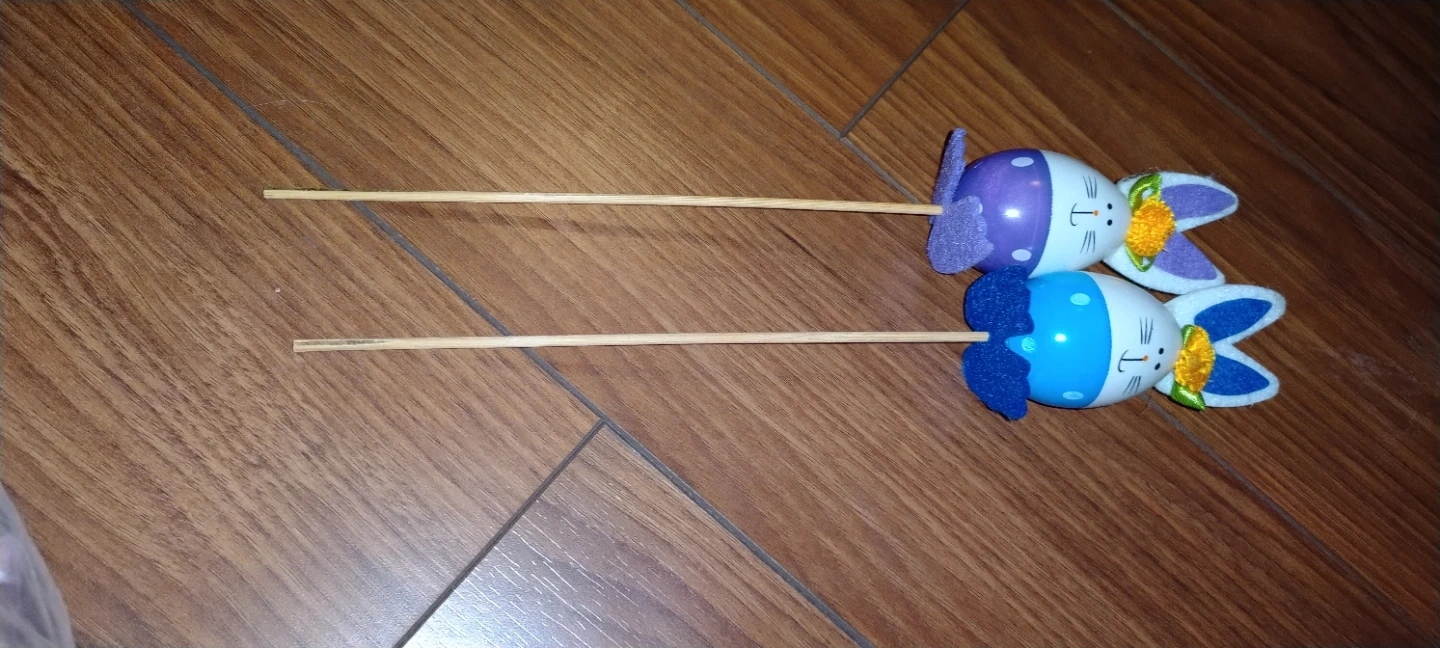 These are bunny picks for Easter decorations. They are made with plastic eggs and fabric ears. They're great for adding a festive touch to baked goods or floral arrangements!