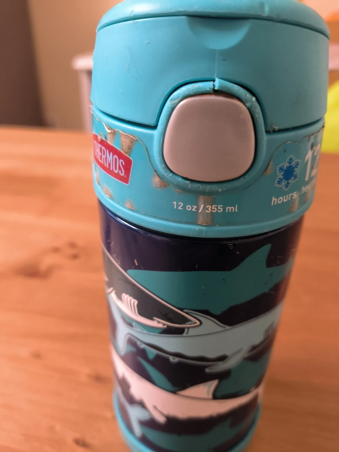 Thermos brand kids' water bottle with a fun shark design. It holds 12 oz or 355 ml and keeps drinks cold for 12 hours. Perfect for school lunches or day trips!