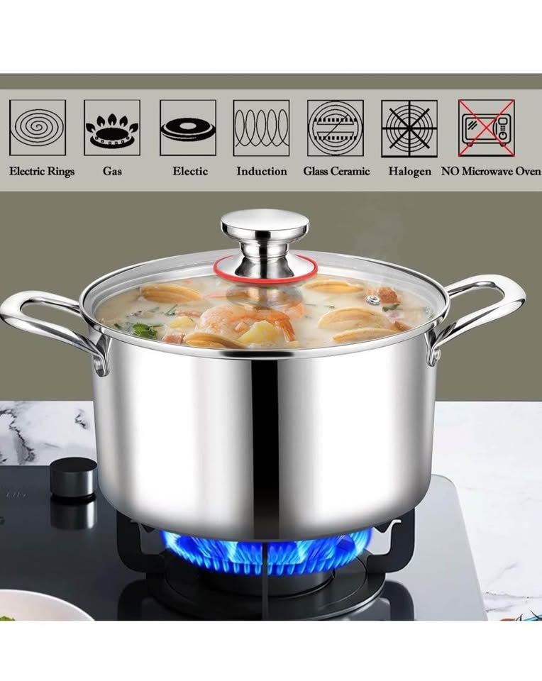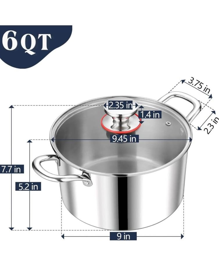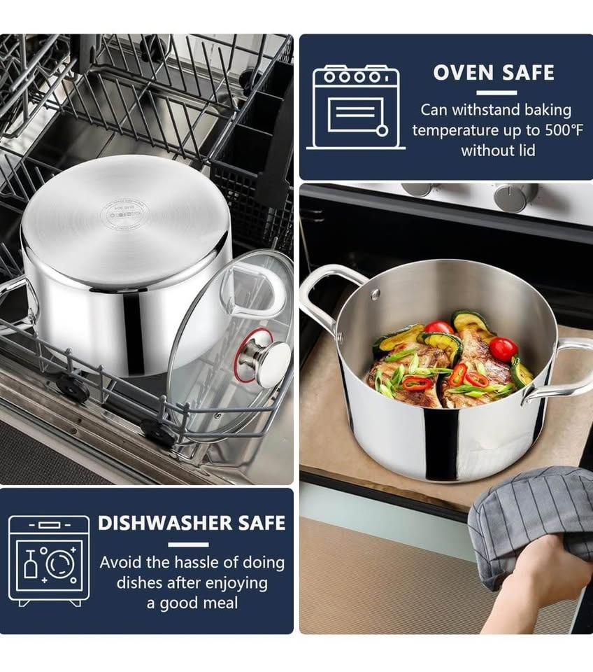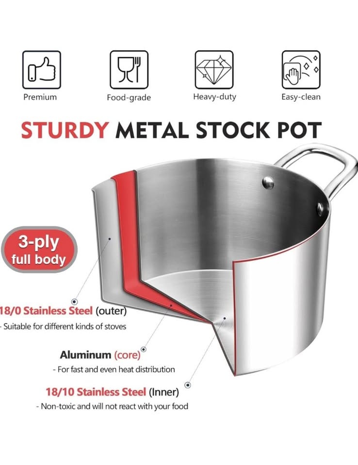 P&P CHEF 6qt stainless steel stock pot which made of premium material is non-toxic and food-grade. Tri-ply pot consists of 18/10 stainless steel interior, aluminum core and magnetic 18/0 stainless steel exterior.