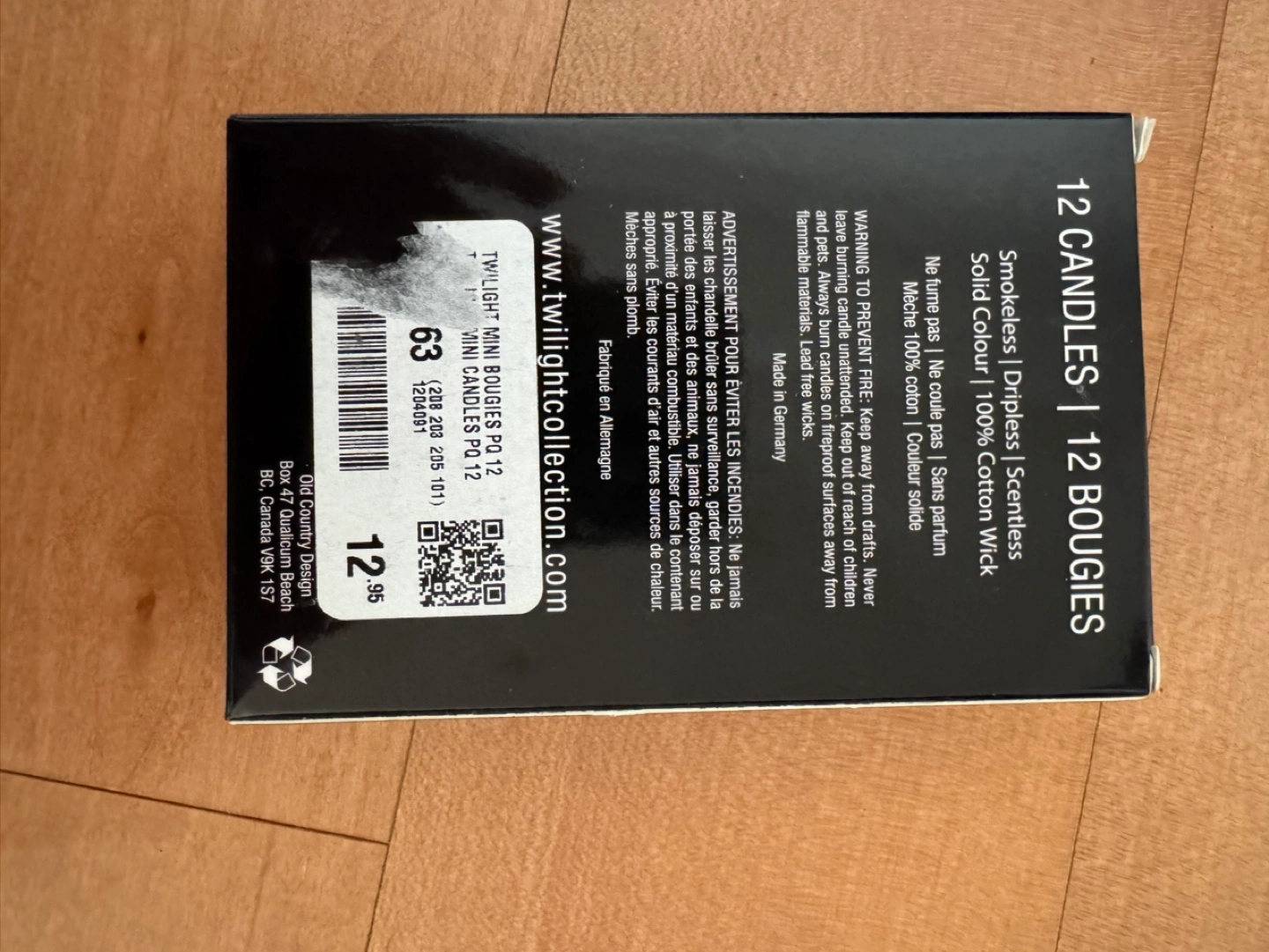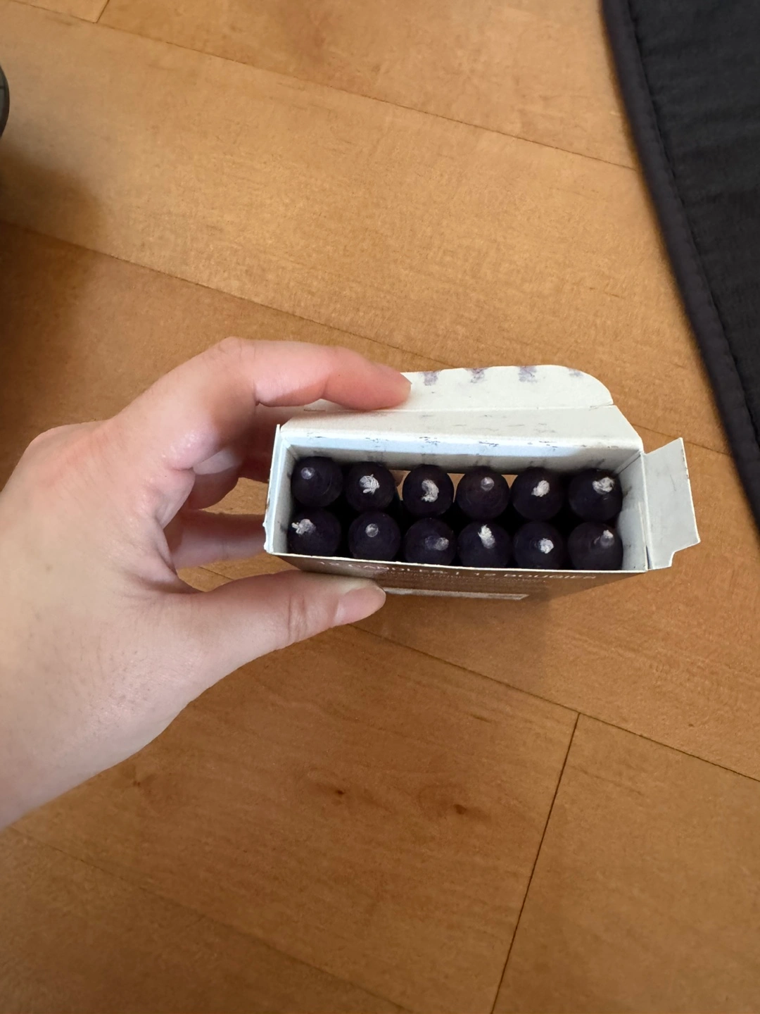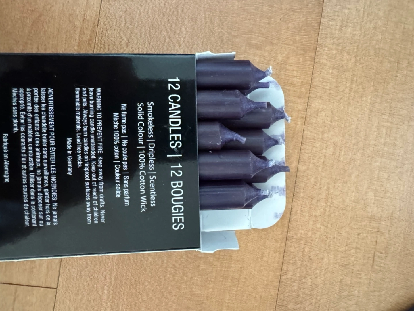 Box of twelve smokeless, scentless, purple mini candles. Solid colour, 100% cotton wick. Made in Germany.