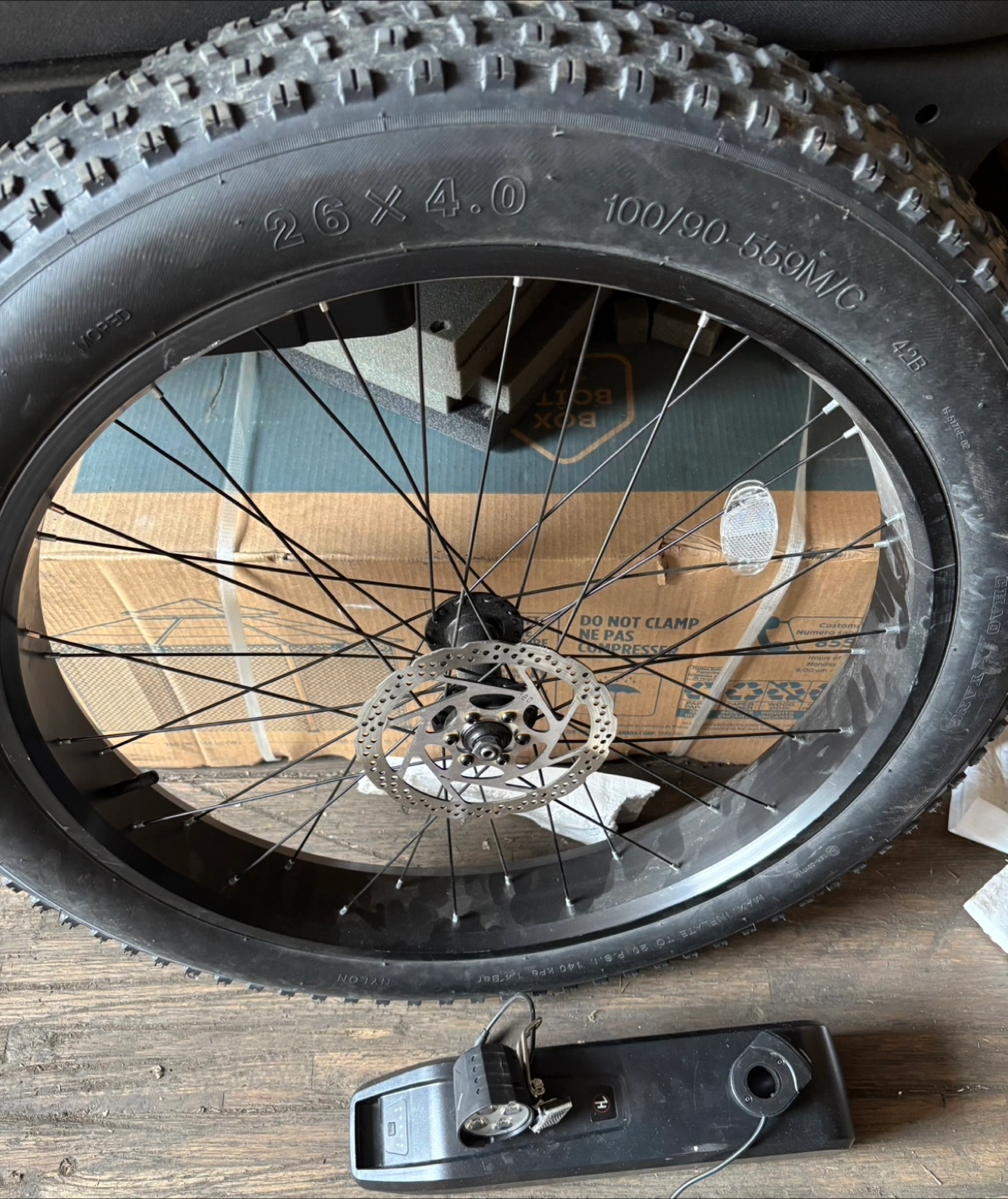 Used e bike parts are available 26x4.0 fat tire ebike wheel. Includes battery and light. Good condition. Black rim, black tire. Ready to install. Starting from $10. Battery: $200 Front wheel: $100 Light: 10.