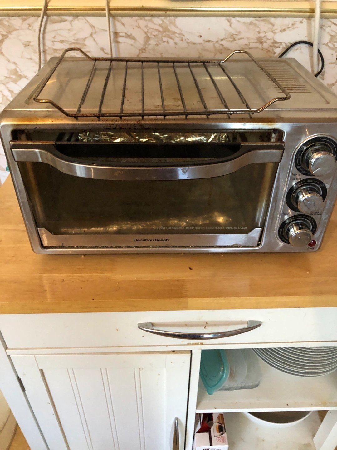 Hamilton Beach toaster oven in working order . Only issue is that the door doesn’t fully close . I’ve been putting a glass btl in front to close firmly . As shown in the photo .