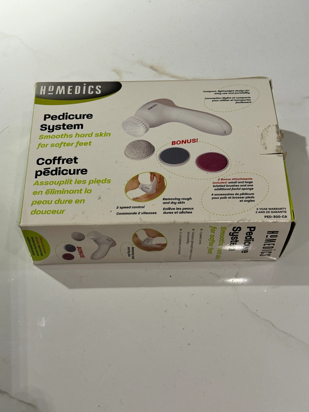 Homedics pedicure system, smooths hard skin for softer feet.Contains small and large bristled brushes and one additional facial sponge.