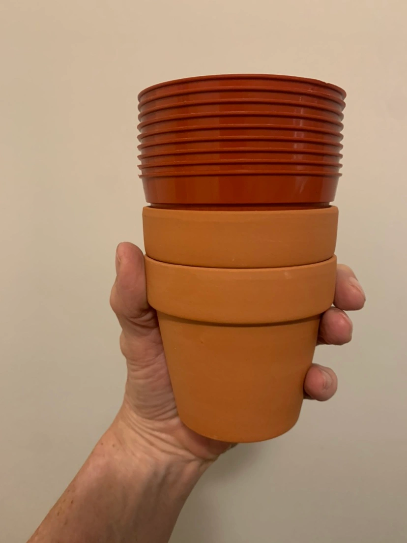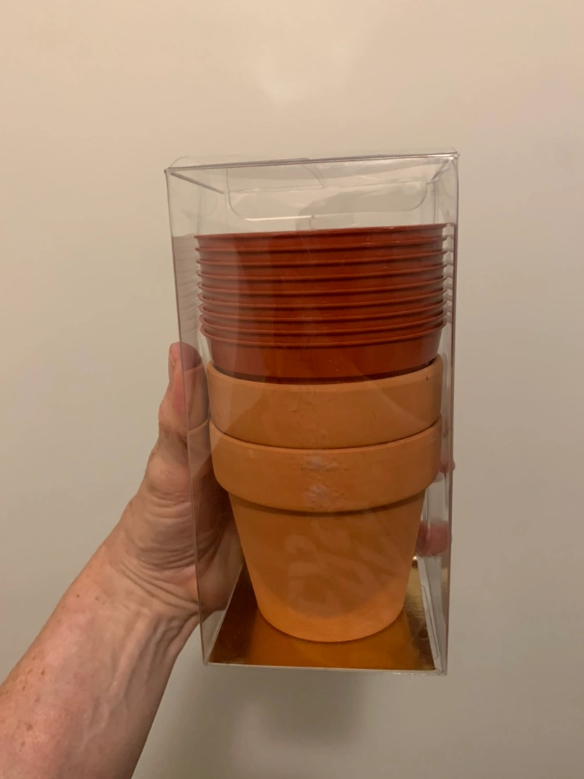 New in box - Seedling starter pot set. 2 small terracotta pots with drainage and 9 plastic pots with drainage.
