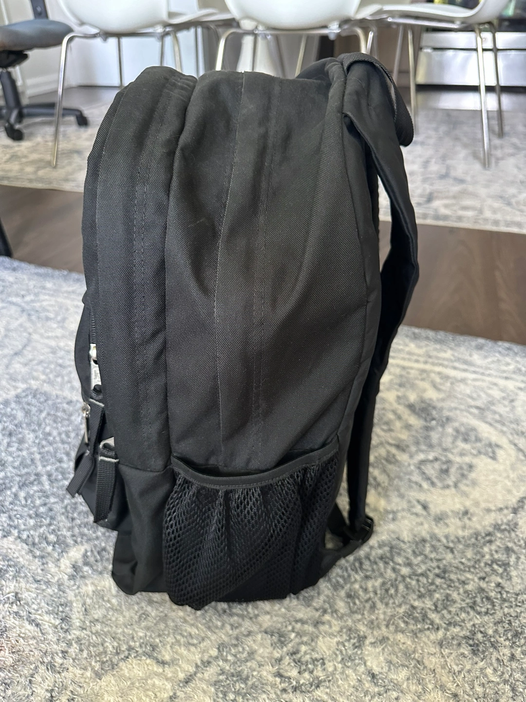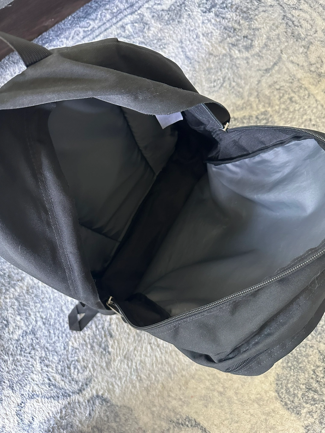 Spacious backpack with padded straps and 5 working zippers (2 large pockets and 3 small to medium pockets at the front).