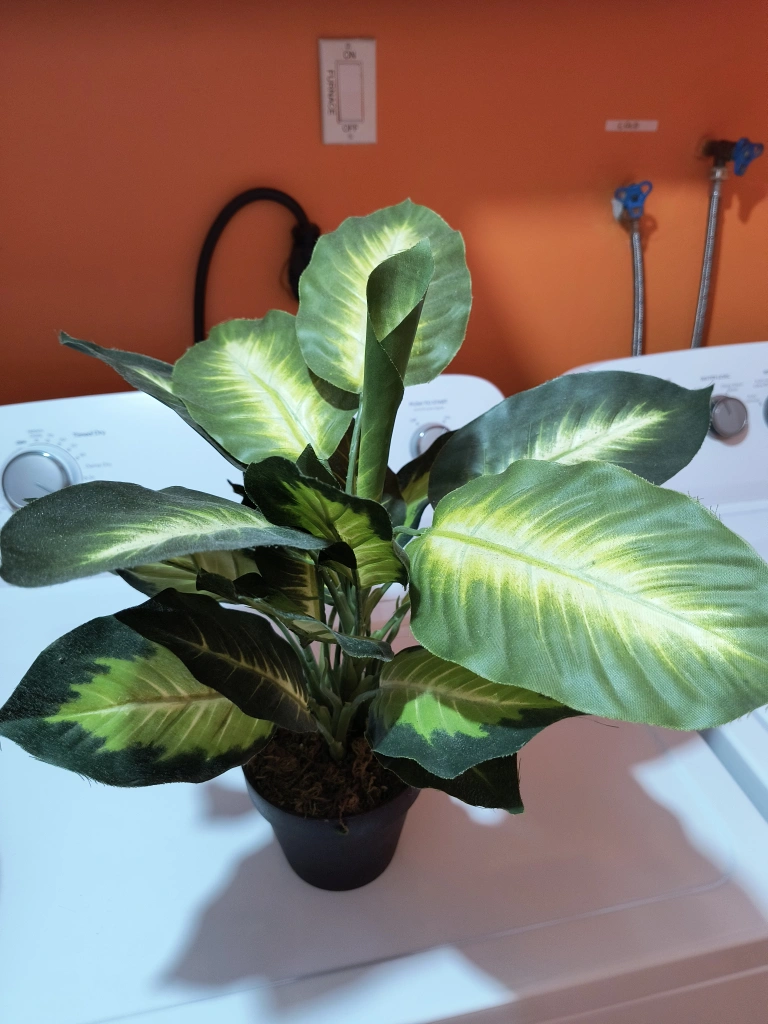 Small artificial plant in a black pot. Perfect for adding a touch of greenery to any space. It does not require any care and will never wilt.