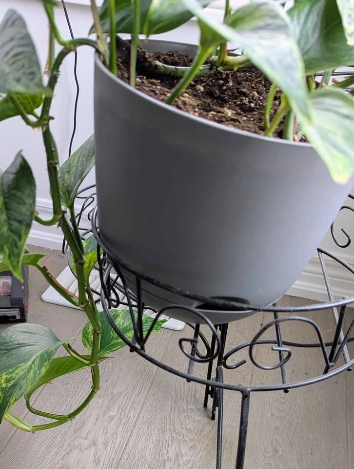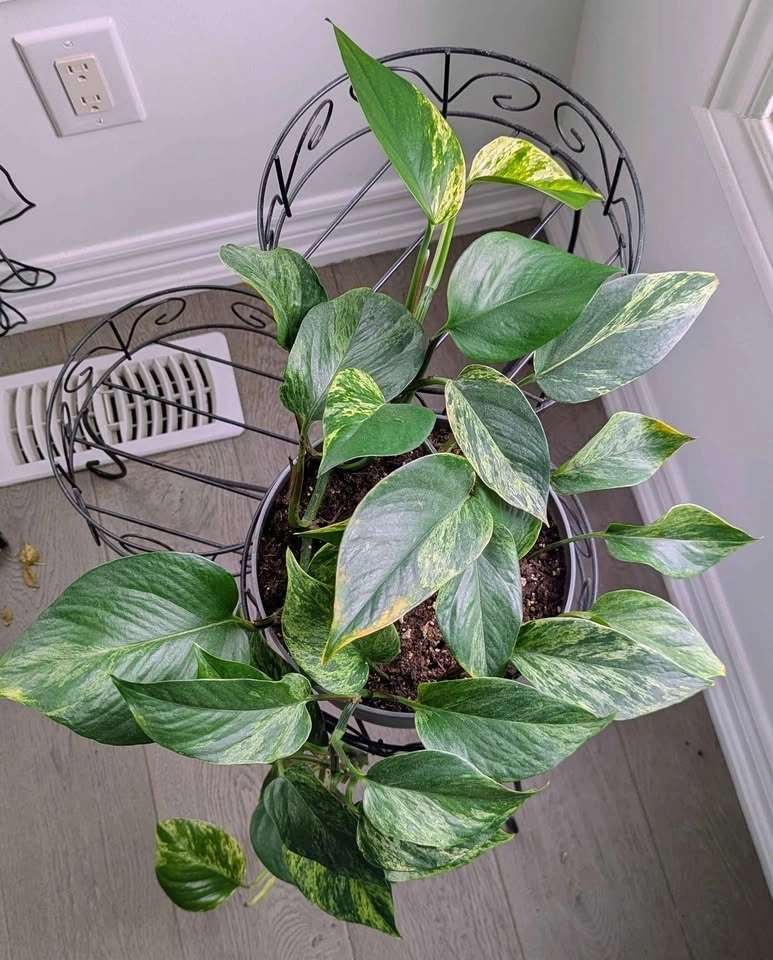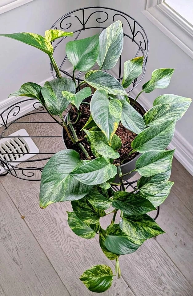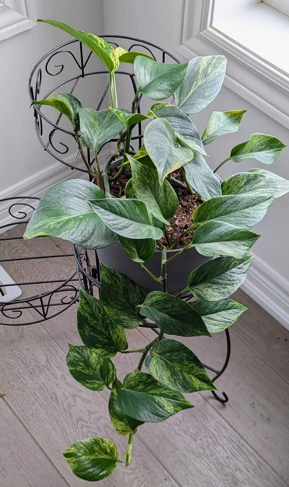 Indoor Pothos plant with pretty green and yellow leaves. Comes in a 9-inch grey pot with a bottom watering hole. Easy care and low maintenance.
