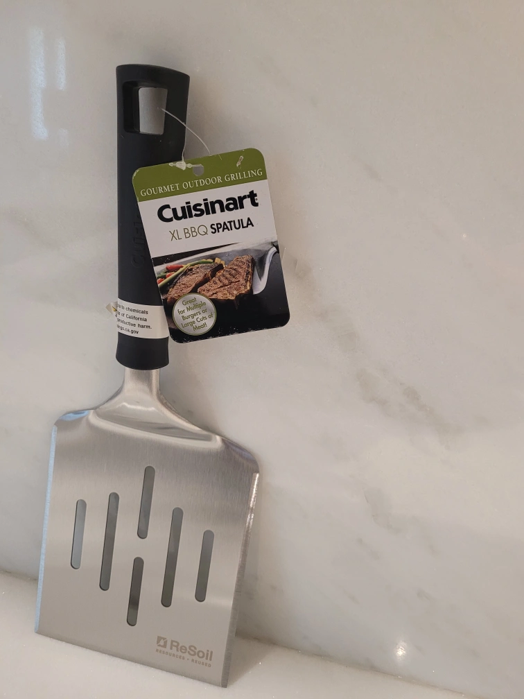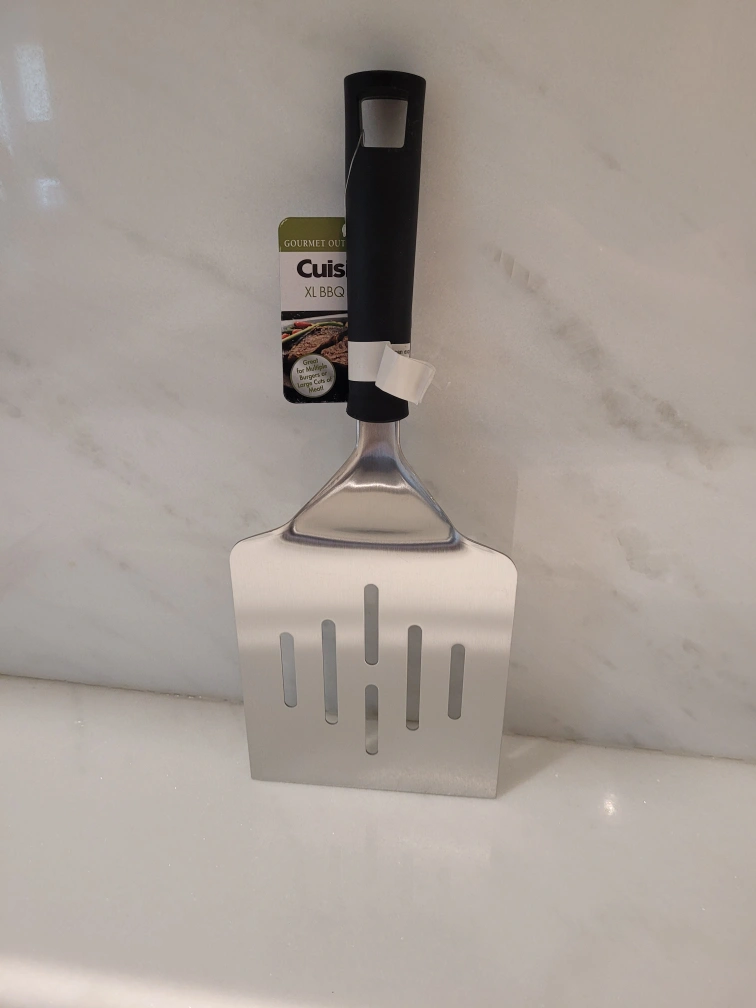 Cuisinart XL BBQ Spatula, with a black handle and stainless steel blade. Great for flipping burgers and other foods on the BBQ. The slotted design allows grease to drain away.