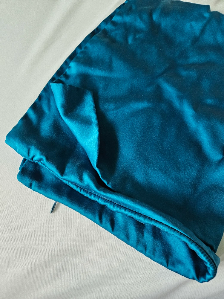 This pillow cover is made of a smooth, soft fabric. It is teal in colour and has a zipper closure.